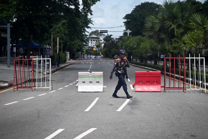 Lực lượng an ninh gác trên đường phố tại Yangon, Myanmar, ngày 19/7/2022. (Ảnh: AFP/TTXVN)