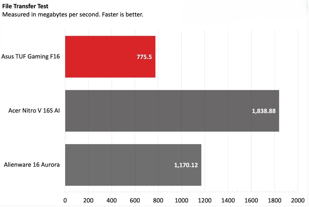 Máy chỉ đi kèm 16GB RAM DDR5-5600 và ổ SSD 512GB. Đáng chú ý, ổ SSD Micron 2500 Series PCIe 4.0 cho tốc độ truyền file khá chậm, chỉ đạt 775.5 MB/giây, thấp hơn đáng kể so với các đối thủ (đạt trên 1.100 MB/giây). Dung lượng 512GB cũng là một hạn chế đối với game thủ khi các tựa game hiện đại ngày càng chiếm nhiều không gian lưu trữ.