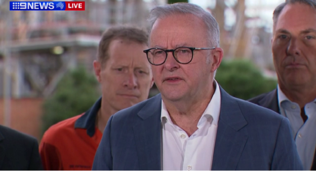 Thủ tướng Australia Anthony Albanese họp báo sau cuộc thị sát nhà máy lọc dầu Viva Energy (Ảnh: Facebook của hãng tin tức 9News).