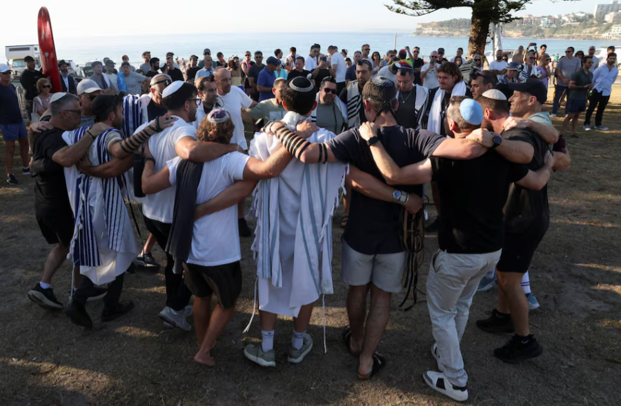 Cộng đồng người Do Thái làm lễ Shacharit (cầu nguyện buổi sáng) trên bãi biển Bondi khi hiện trường vụ án được mở cửa trở lại sau vụ xả súng hàng loạt (Ảnh: REUTERS/Hollie Adams).