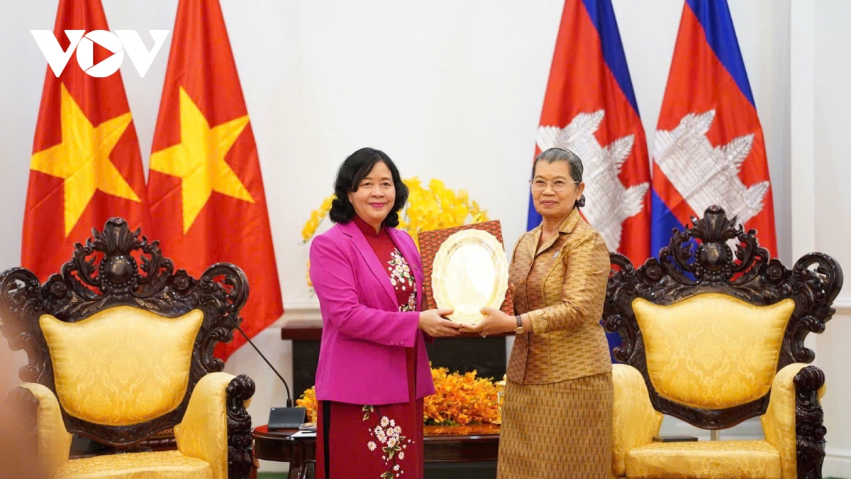 Trong khuôn khổ chuyến thăm cấp Nhà nước tới Vương quốc Campuchia của Tổng Bí thư Tô Lâm và đoàn đại biểu cấp cao Việt Nam, chiều 6/2, tại Thủ đô Phnom Penh, bà Bùi Thị Minh Hoài, Ủy viên Bộ Chính trị, Bí thư Trung ương Đảng, Chủ tịch Ủy ban Trung ương Mặt trận Tổ quốc Việt Nam đã có cuộc gặp với bà Men Sam An, Phó Chủ tịch Đảng Nhân dân Campuchia (CPP), Chủ tịch Hội đồng quốc gia Mặt trận Đoàn kết Phát triển Tổ quốc Campuchia.