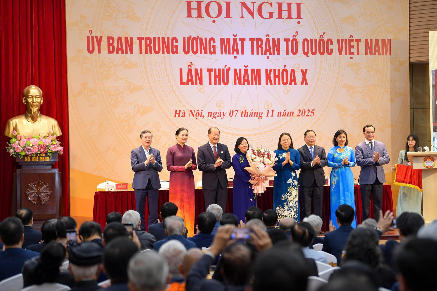 Đoàn Chủ tịch Ủy ban Trung ương MTTQ Việt Nam tặng hoa chúc mừng bà Bùi Thị Minh Hoài
