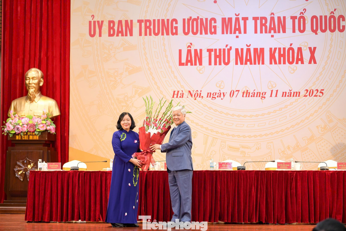 Ông Đỗ Văn Chiến, Ủy viên Bộ Chính trị tặng hoa chúc mừng bà Bùi Thị Minh Hoài.