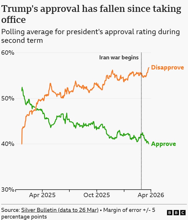 Tỷ lệ ủng hộ Tổng thống Donald Trump giảm dần trong nhiệm kỳ hai, trong khi mức phản đối gia tăng, đặc biệt sau khi chiến sự Iran bắt đầu. Nguồn: Silver Bulletin. Biểu đồ: BBC