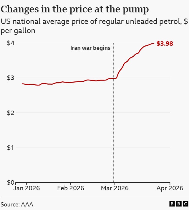 Giá xăng tại Mỹ tăng vọt kể khi nước này bắt đầu các cuộc không kích nhằm vào Iran. Nguồn: Hiệp hội ô tô Mỹ. Biểu đồ: BBC
