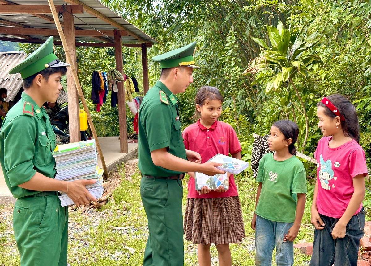 Học sinh bản Sắt được Đồn biên phòng Làng Mô tặng sách vở cho năm học mới. Ảnh: CTV