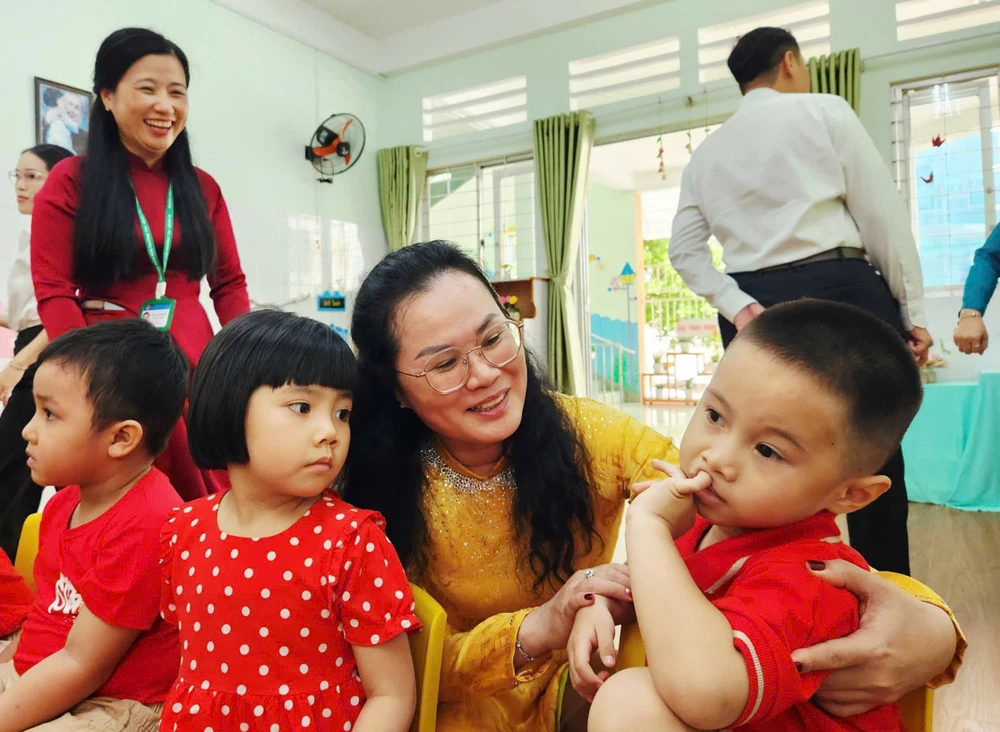 Bà Lê Thụy Mỵ Châu, Phó Giám đốc Sở GD&ĐT TP.HCM, cùng với các bé Trường Mầm non Tuổi Thơ, phường Hòa Hưng. Ảnh: TH