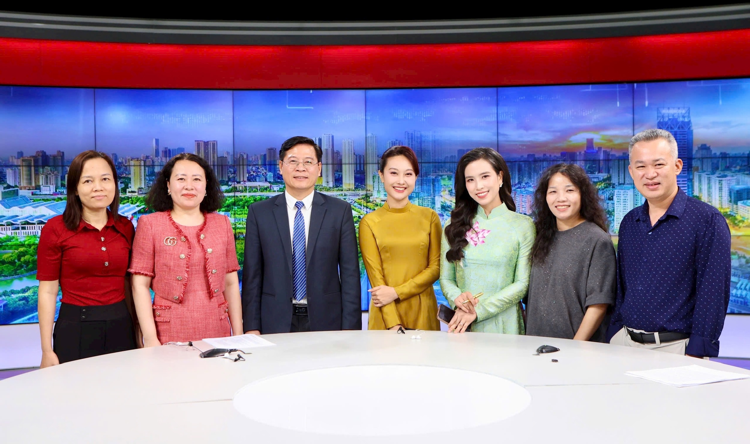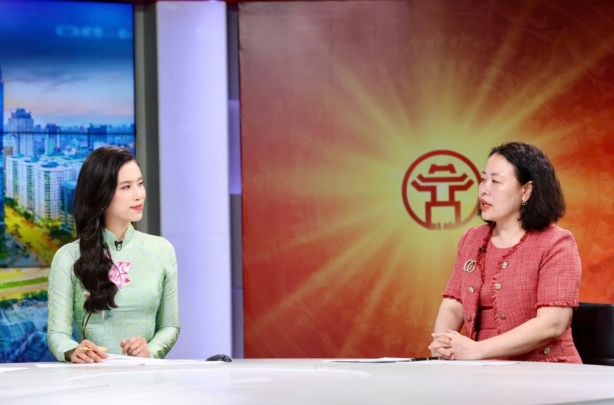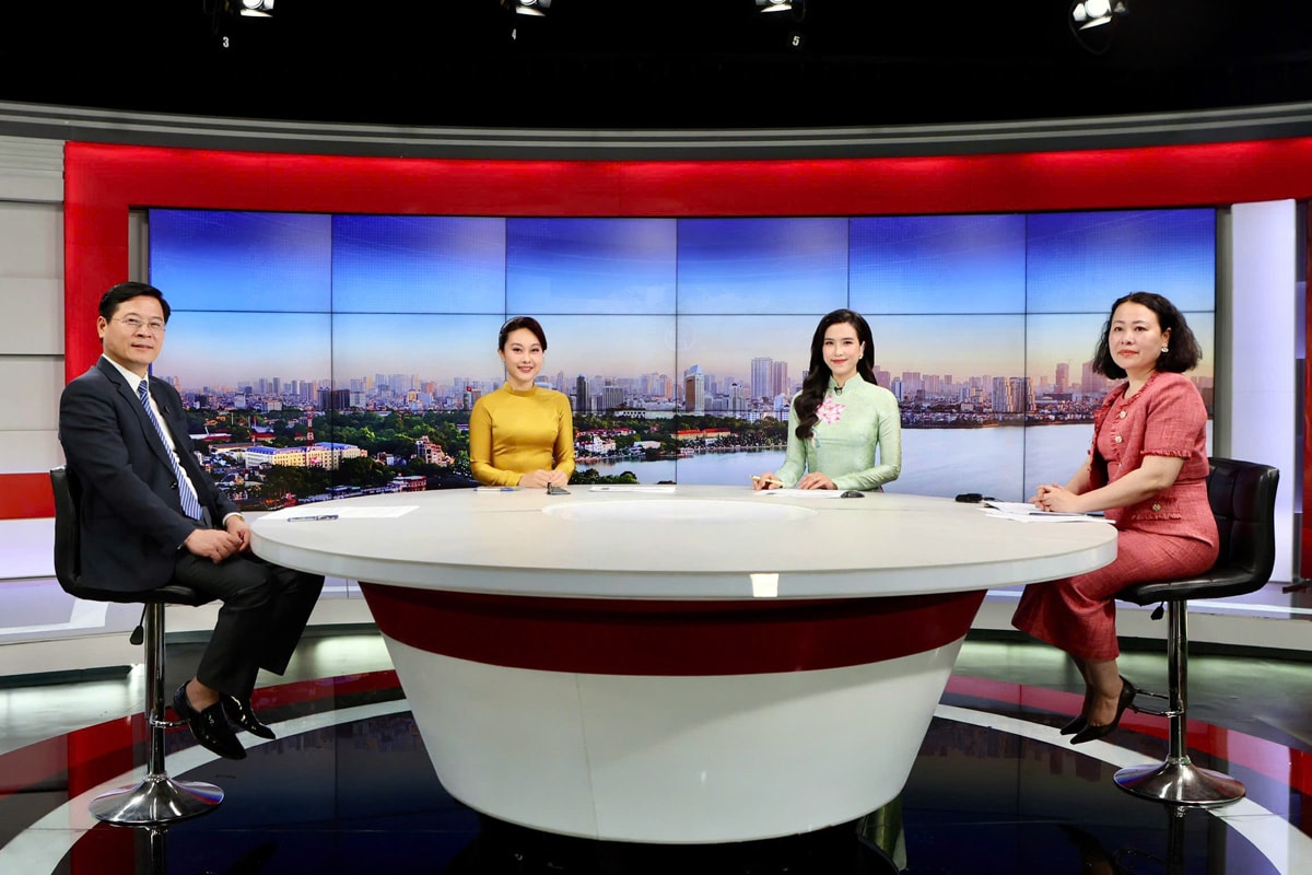 Hai khách mời tham gia chương trình thời sự tại trường quay S1 của Cơ quan Báo và Phát thanh, Truyền hình Hà Nội. Ảnh: Viết Thành