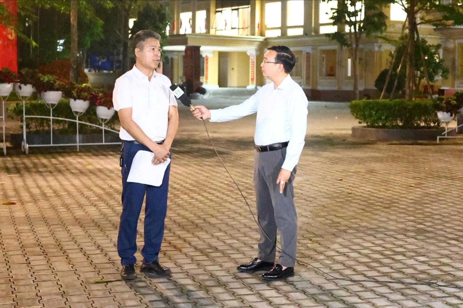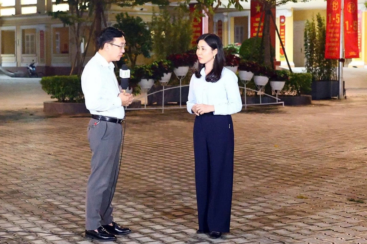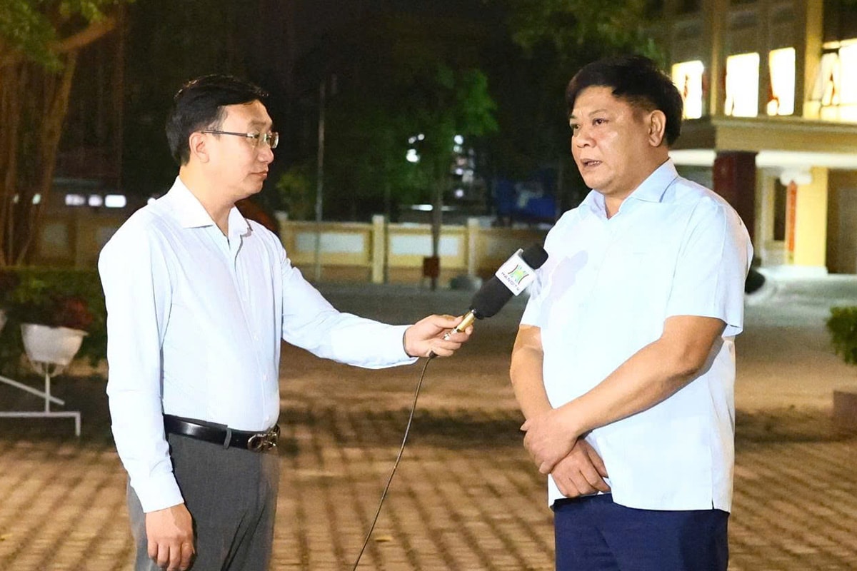 Phó Bí thư Thường trực Đảng ủy xã Thạch Thất Nguyễn Đăng Quân trao đổi với phóng viên Cơ quan Báo và Phát thanh, Truyền hình Hà Nội tại điểm cầu xã Thạch Thất. Ảnh: PV