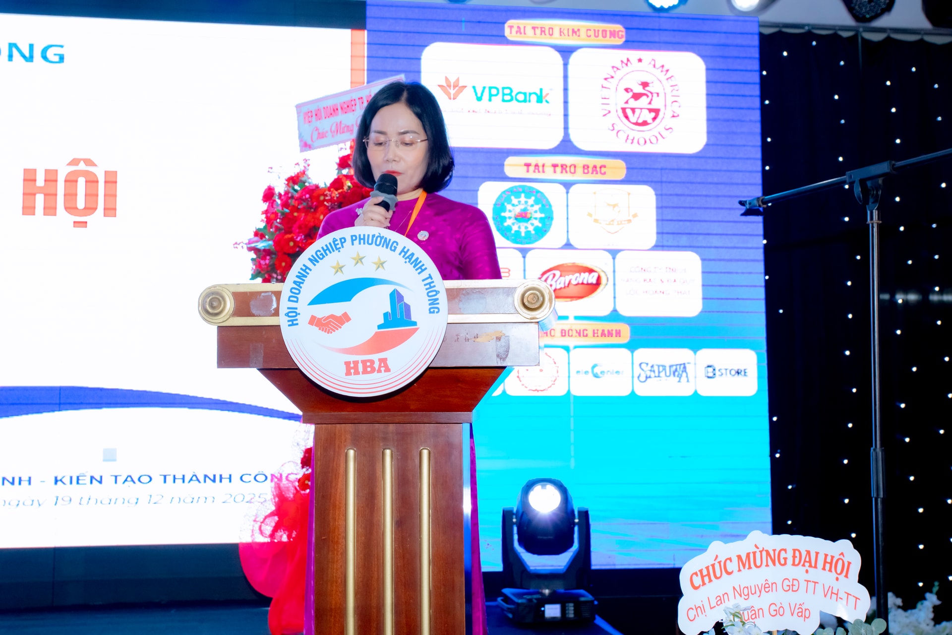 Bà Ngô Thanh Hạnh - Chủ tịch Hội Doanh nghiệp phường Hạnh Thông nhiệm kỳ 2025 - 2030 phát biểu tại Đại hội