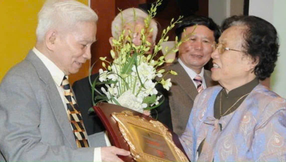 Bà Nguyễn Thị Bình trao giải văn hóa Phan Châu Trinh cho GS. Hoàng Tụy. Ảnh: Tư liệu