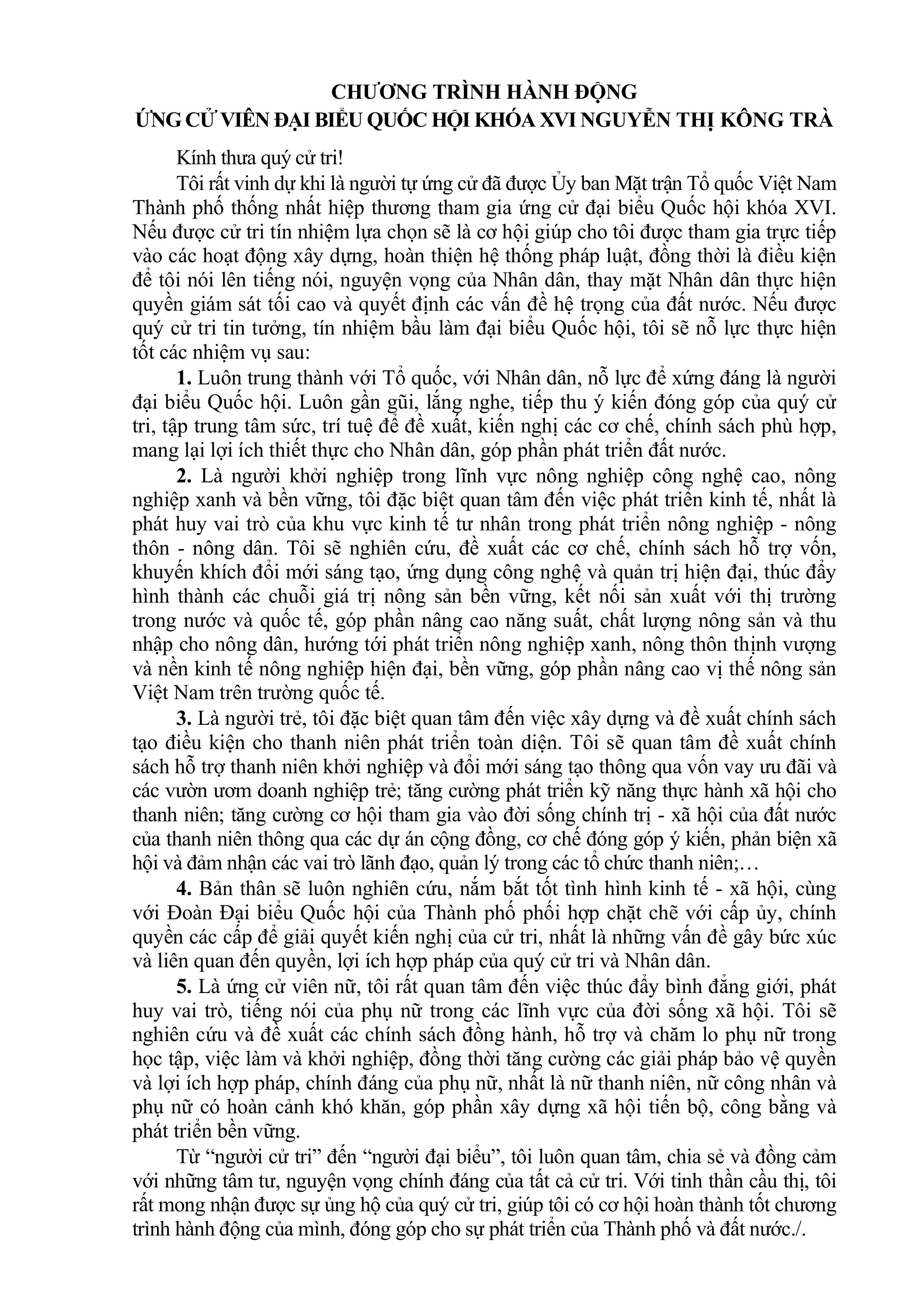 Bà Nguyễn Thị Kông Trà (Nguyễn Ngọc Hương), Giám đốc điều hành Công ty TNHH Xuất nhập khẩu Thiên nhiên Việt, ứng cử đại biểu Quốc hội khóa XVI tại đơn vị bầu cử số 12 TP.HCM.