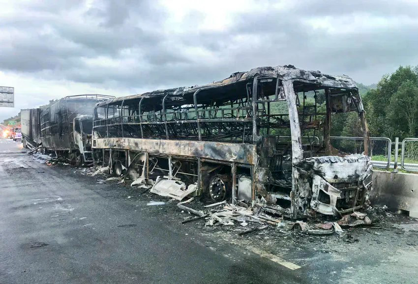 Sau va chạm liên hoàn, xe khách và xe tải bốc cháy dữ dội và bị thiêu rụi hoàn toàn, xe đầu kéo cháy rụi phần đầu.Rất may, vụ tai nạn không gây thương vong về người. Cả 3 tài xế cùng hành khách trên xe khách đã kịp thời thoát ra ngoài an toàn.