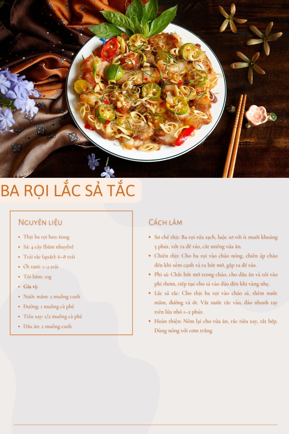 Thành phẩm là đĩa ba rọi lắc sả tắc có màu vàng nâu bắt mắt, miếng thịt óng nhẹ, mùi sả thơm lừng xen lẫn hương tắc chua dịu. Món ăn này hợp dùng với cơm trắng, ăn kèm dưa leo, rau sống hoặc canh thanh nhẹ để cân vị. Ba rọi lắc sả tắc không chỉ phù hợp cho bữa cơm gia đình mà còn là món mặn “đắt khách” trong các quán cơm trưa nhờ hương vị dễ ăn và không bị ngán.