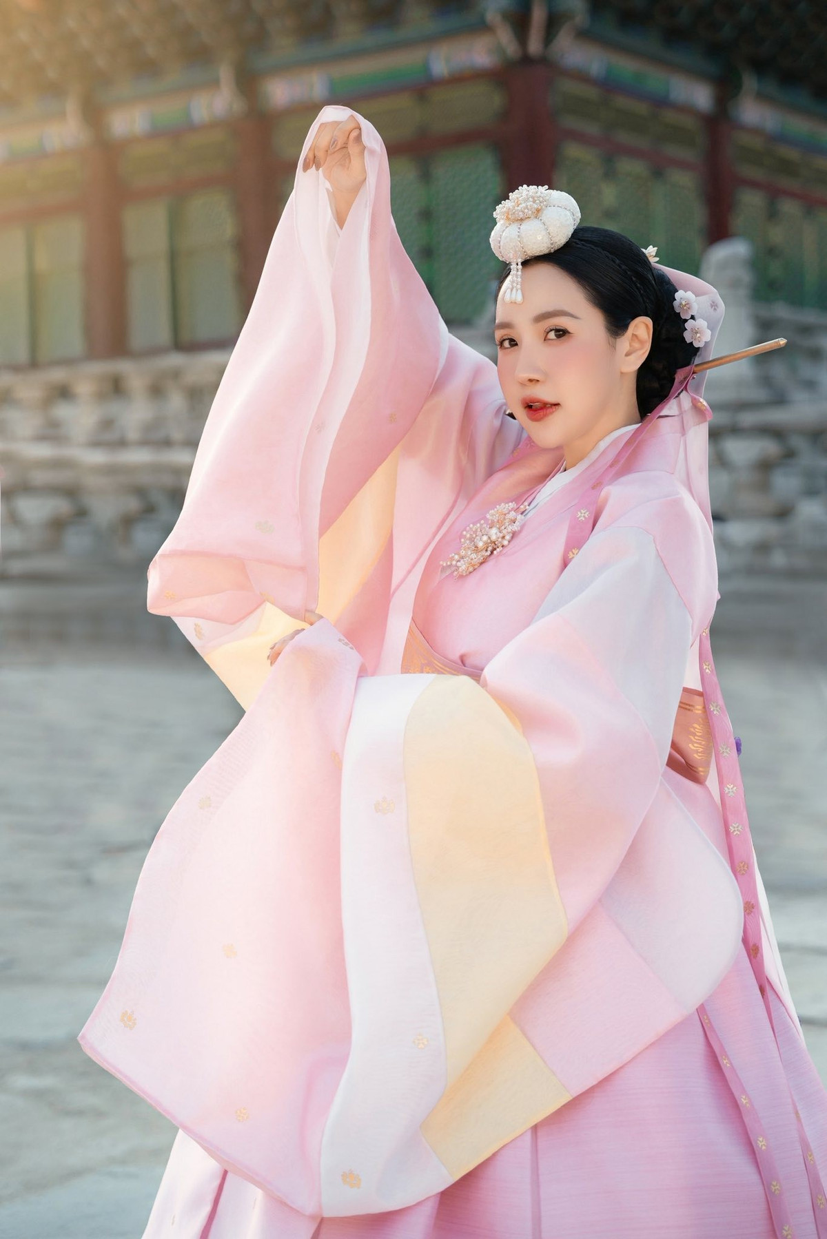 Trong bộ hanbok hồng thanh lịch, Viên Vibi khoe trọn nét đẹp đằm thắm của mình. Làn da trắng mịn nổi bật dưới ánh nắng dịu, đôi mắt to tròn ánh lên vẻ dịu dàng khiến gương mặt càng thêm cuốn hút.