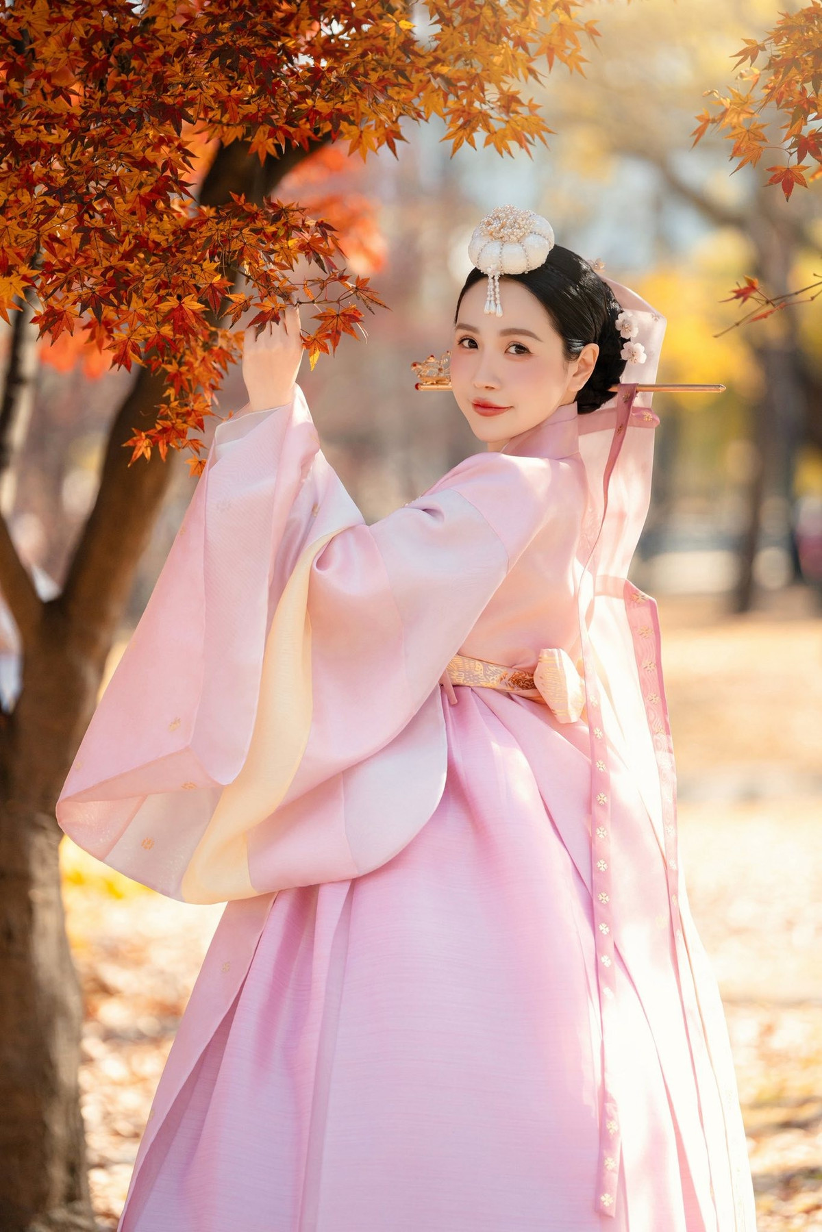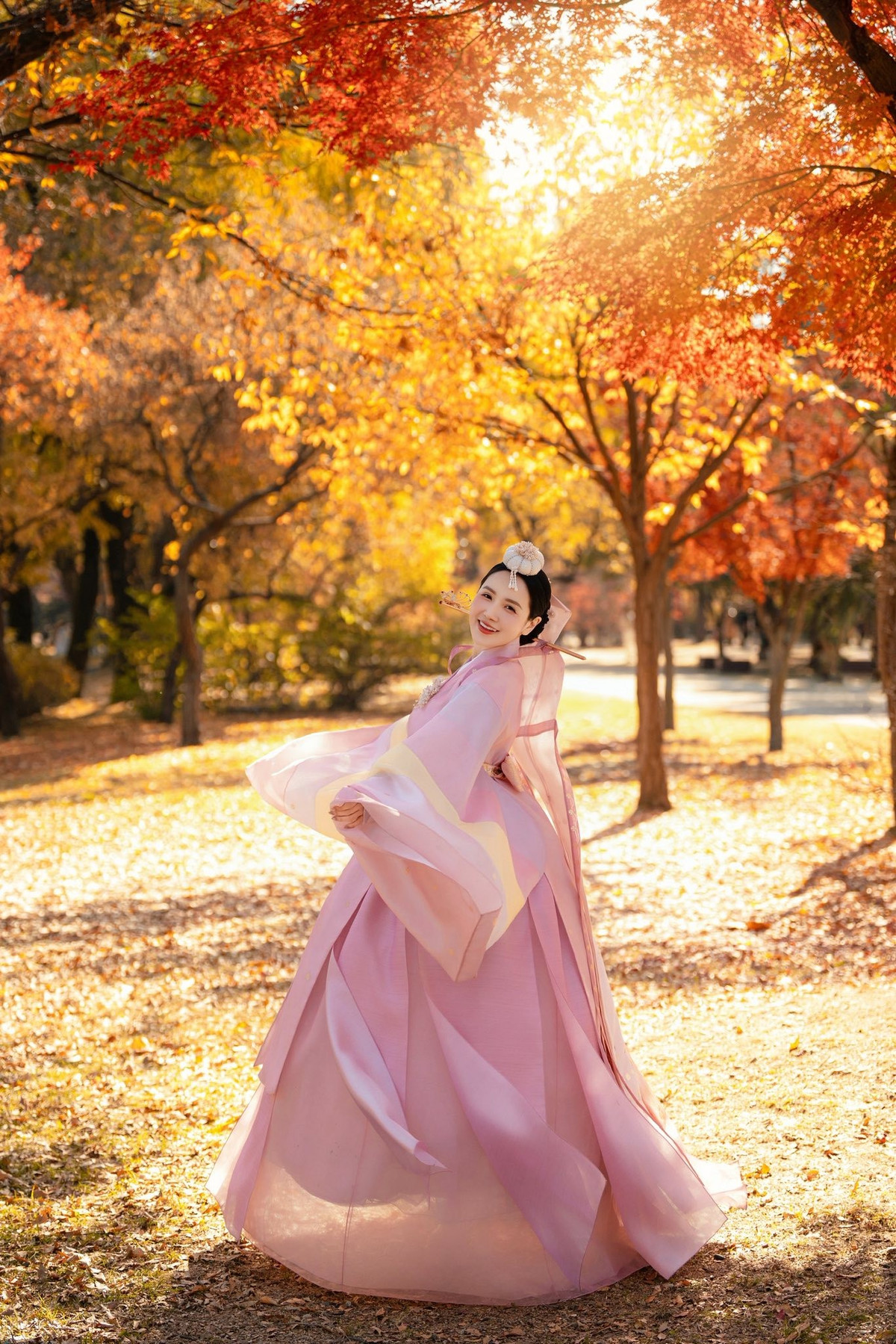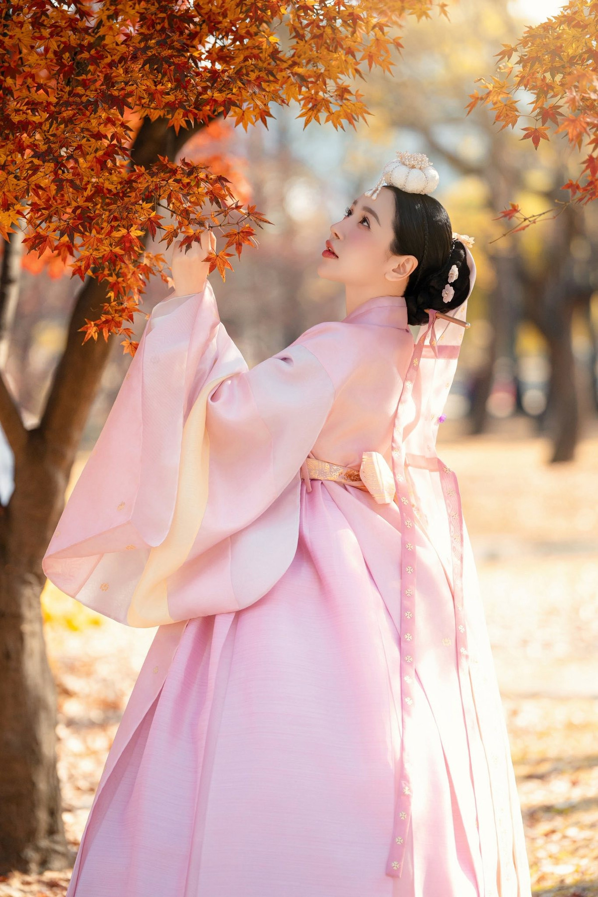 Sắc vàng – đỏ của tán lá mùa thu hòa quyện cùng gam hồng pastel dịu dàng của bộ hanbok, tạo nên tổng thể nhẹ nhàng, thơ mộng như bước ra từ một bộ phim cổ trang.