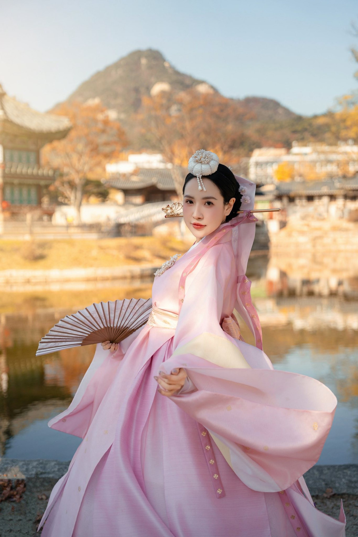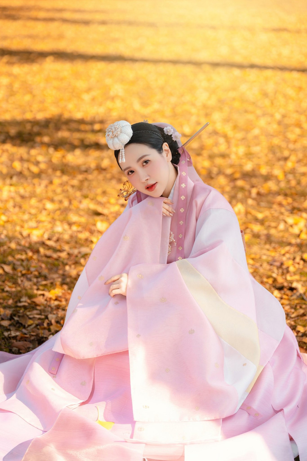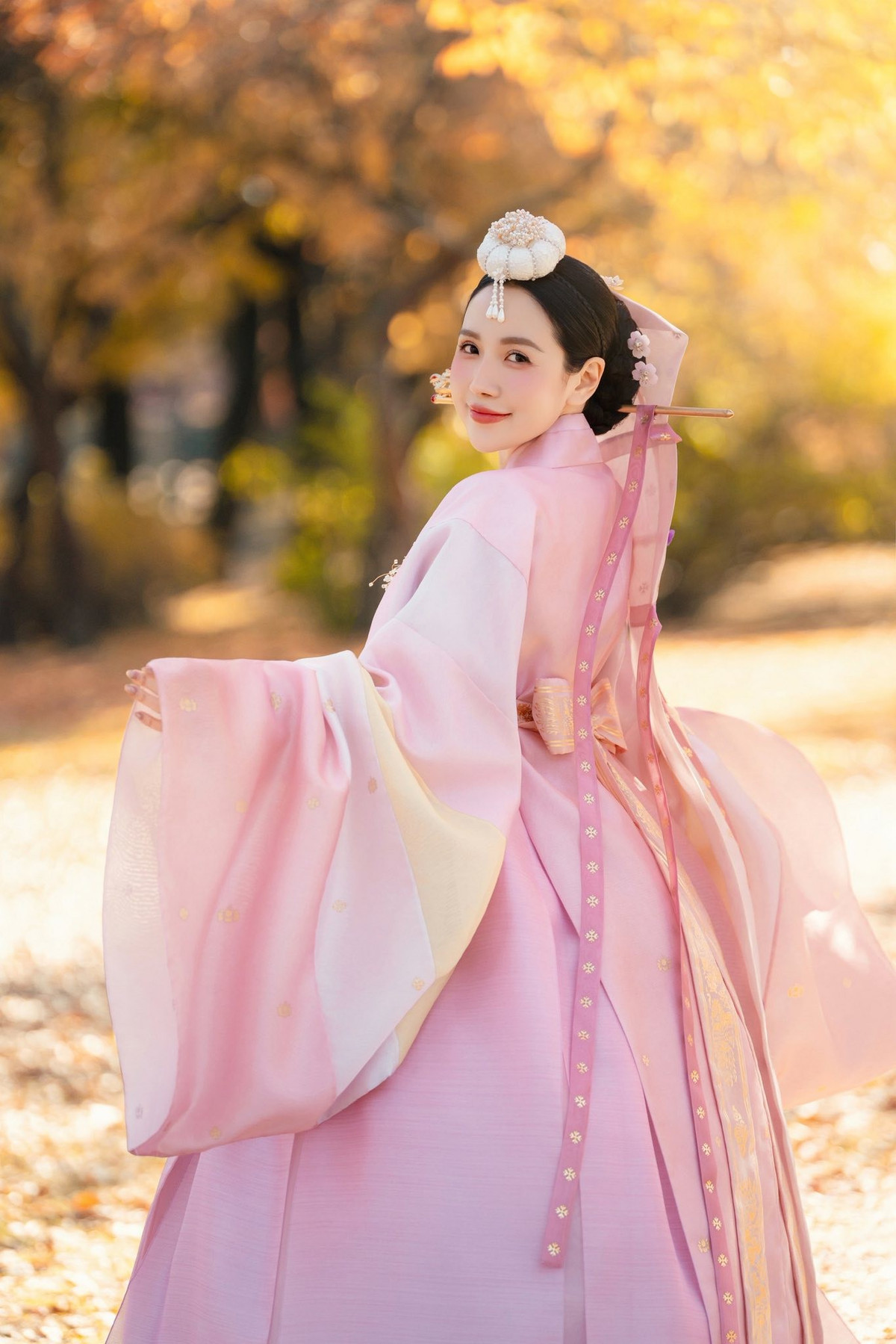 Sắc vàng – đỏ của tán lá mùa thu hòa quyện cùng gam hồng pastel dịu dàng của bộ hanbok, tạo nên tổng thể nhẹ nhàng, thơ mộng như bước ra từ một bộ phim cổ trang.