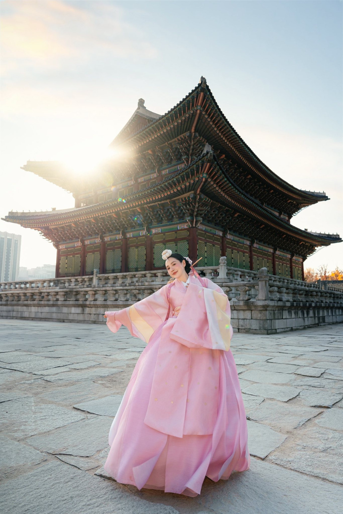 Ở mỗi khung hình, Viên Vibi toát lên thần thái nhẹ nhàng nhưng đầy cuốn hút: khi thì mỉm cười ngọt ngào, lúc lại e ấp giữa sắc lá vàng, hay xoay nhẹ tà váy bên cạnh cung điện cổ kính. Sự mềm mại của hanbok kết hợp với dáng vẻ uyển chuyển của cô tạo nên những tấm ảnh đẹp tựa tranh vẽ.