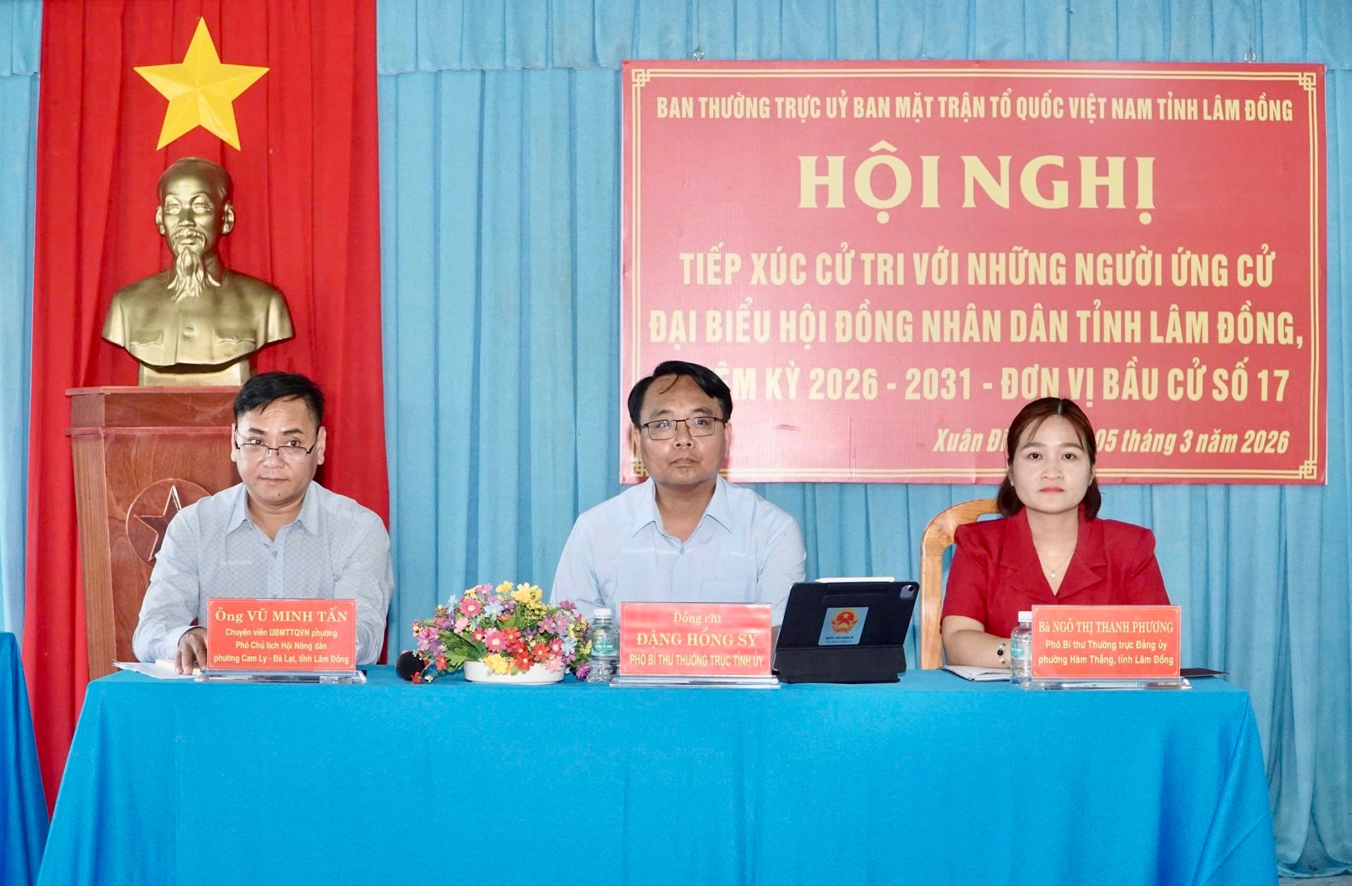 Ba ứng cử viên đại biểu HĐND tỉnh nhiệm kỳ 2026 - 2031 thuộc Đơn vị bầu cử số 17 gồm các ông, bà: Đặng Hồng Sỹ, Phó Bí thư Thường trực Tỉnh ủy Lâm Đồng; Ngô Thị Thanh Phương, Phó Bí thư Thường trực Đảng ủy phường Hàm Thắng; Vũ Minh Tấn, chuyên viên Ủy ban MTTQ Việt Nam phường, Phó Chủ tịch Hội Nông dân phường Cam Ly - Đà Lạt.