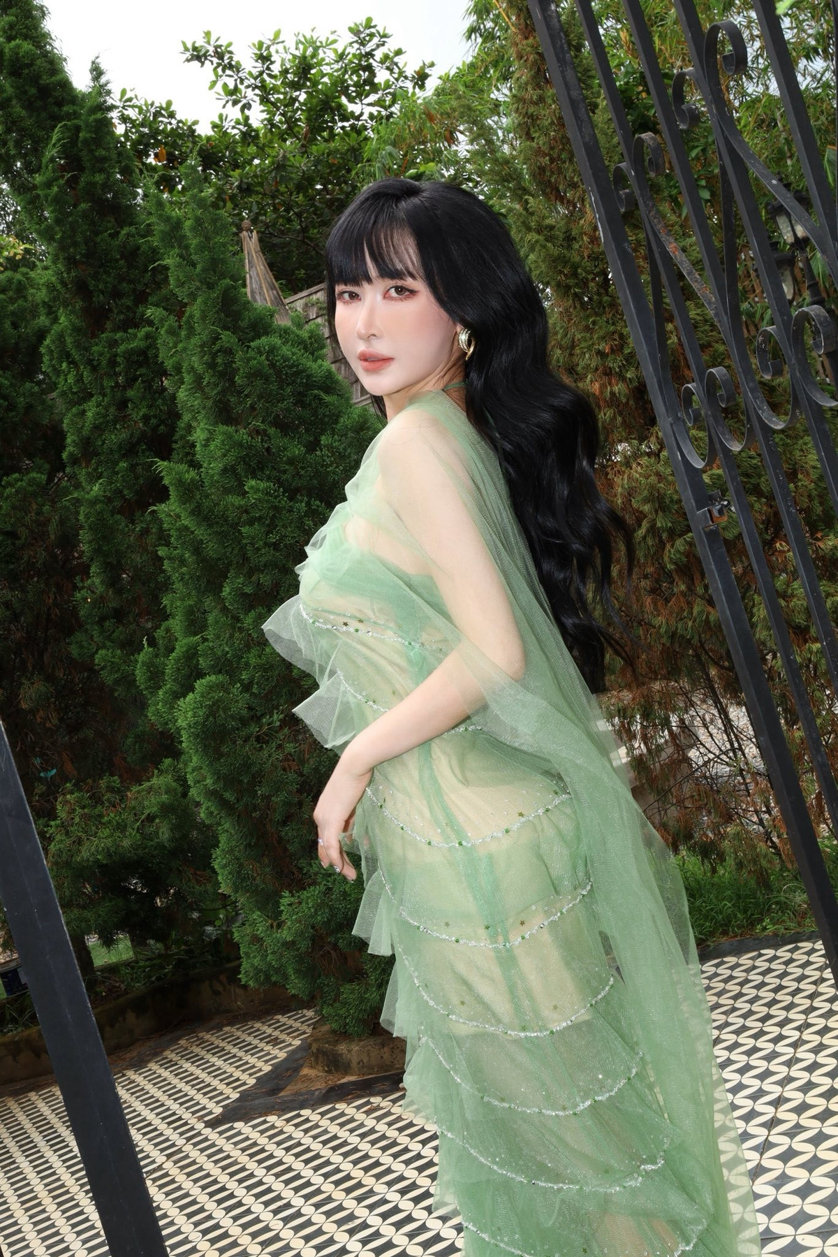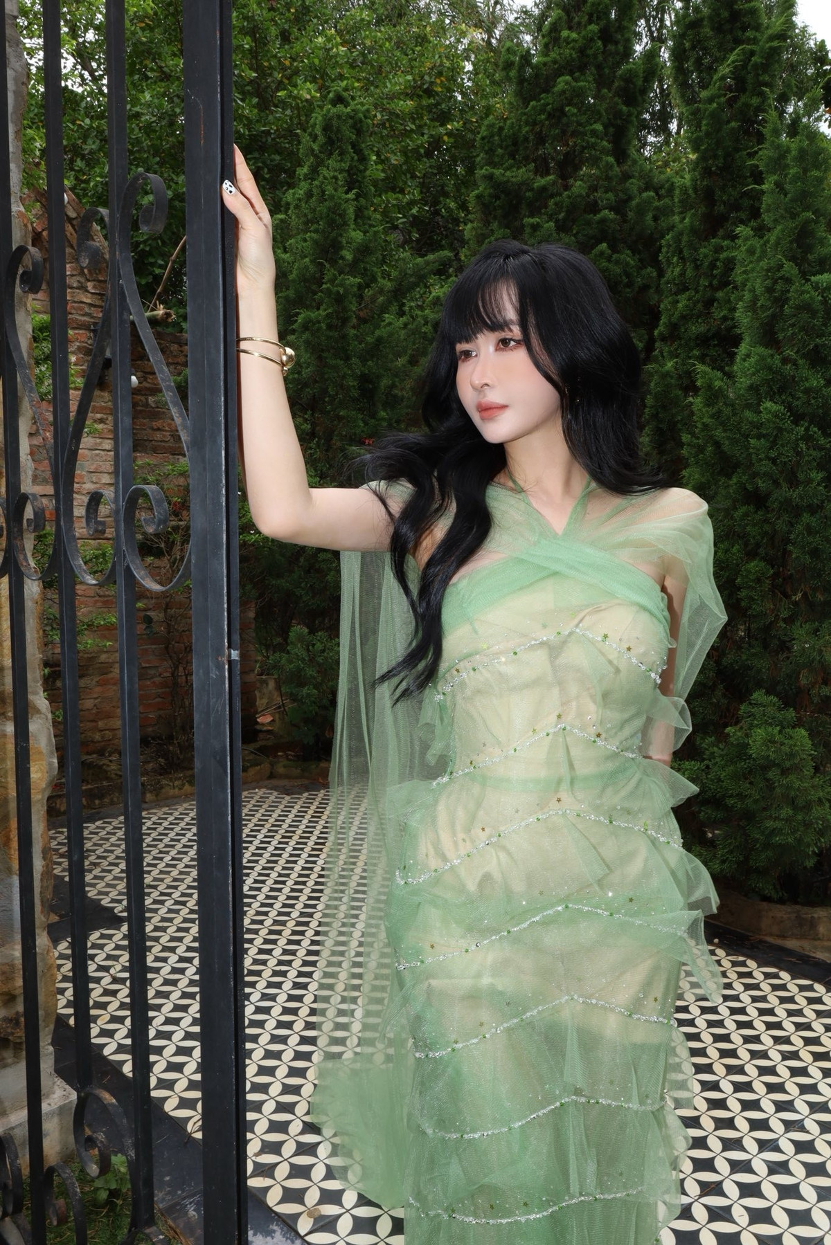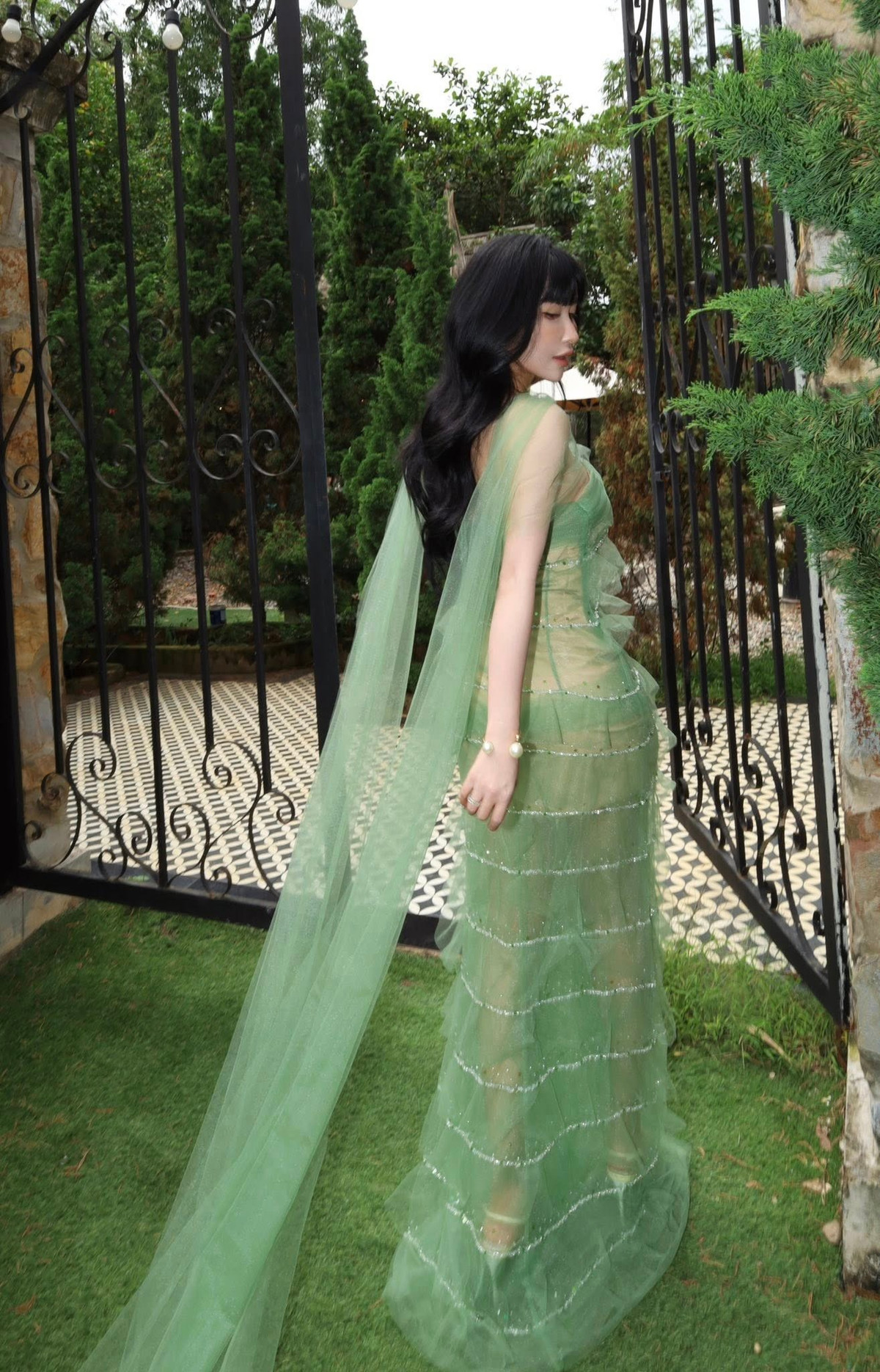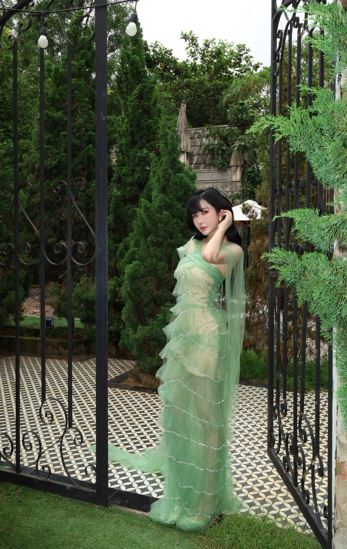 Trang phục này không chỉ giúp cô hòa mình vào không gian xanh mát của khu vườn mà còn khéo léo khoe được đường nét cơ thể thanh thoát. (Ảnh: FBNV)