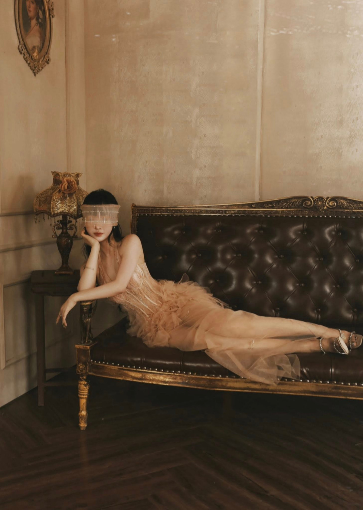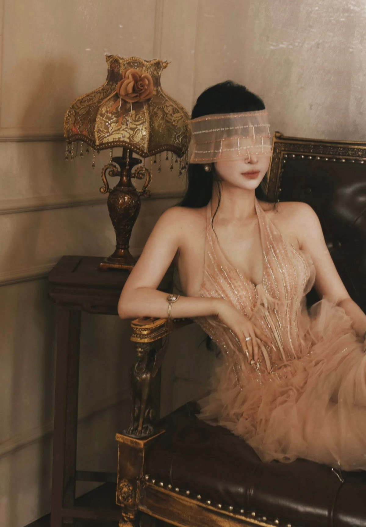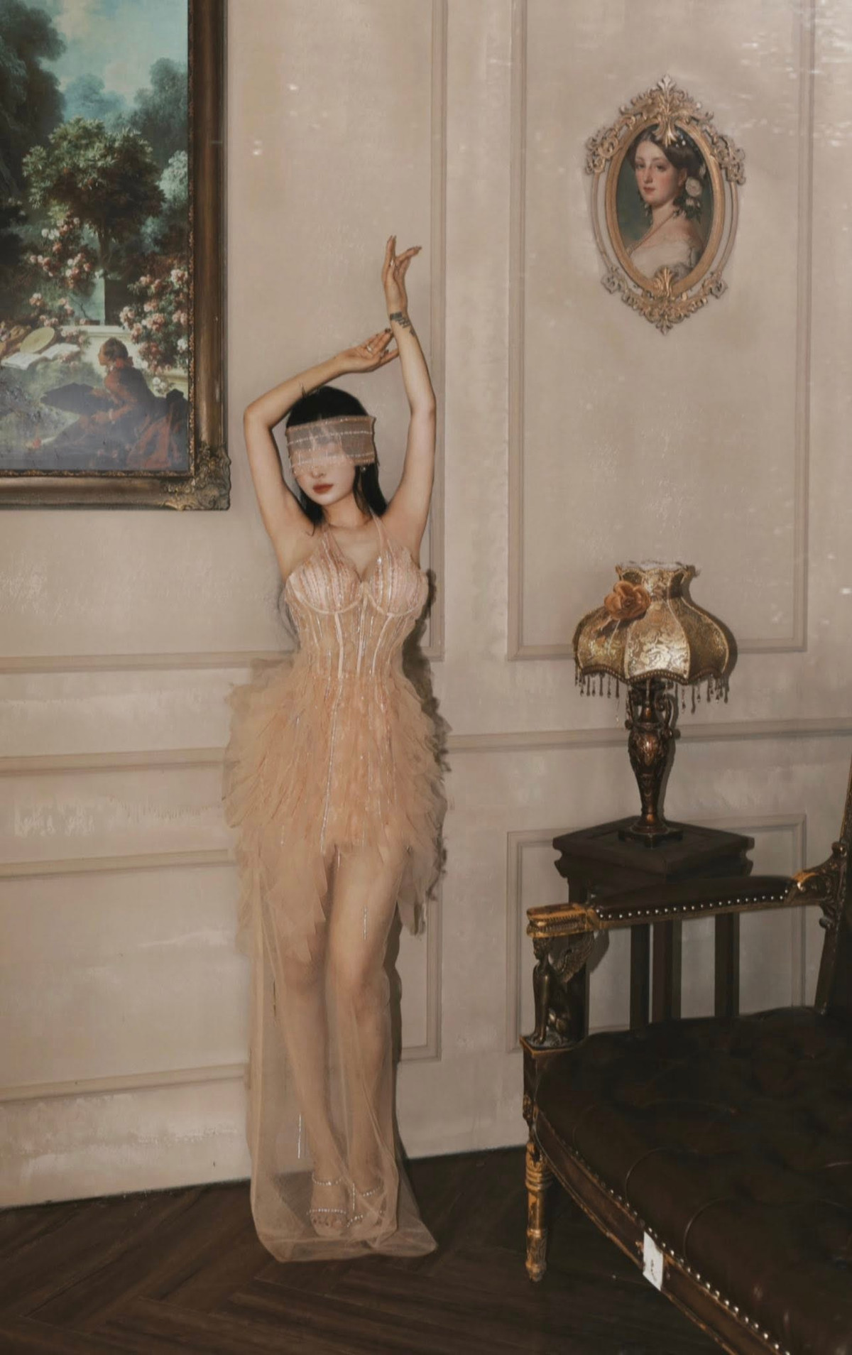 Trong một bộ ảnh, Mina Phạm diện thiết kế theo phom corset siết eo, chân váy xòe bồng bềnh bằng chất liệu xuyên thấu, đính kết lấp lánh giúp cô khoe trọn vòng một gợi cảm và đôi chân thon dài. (Ảnh: FBNV)