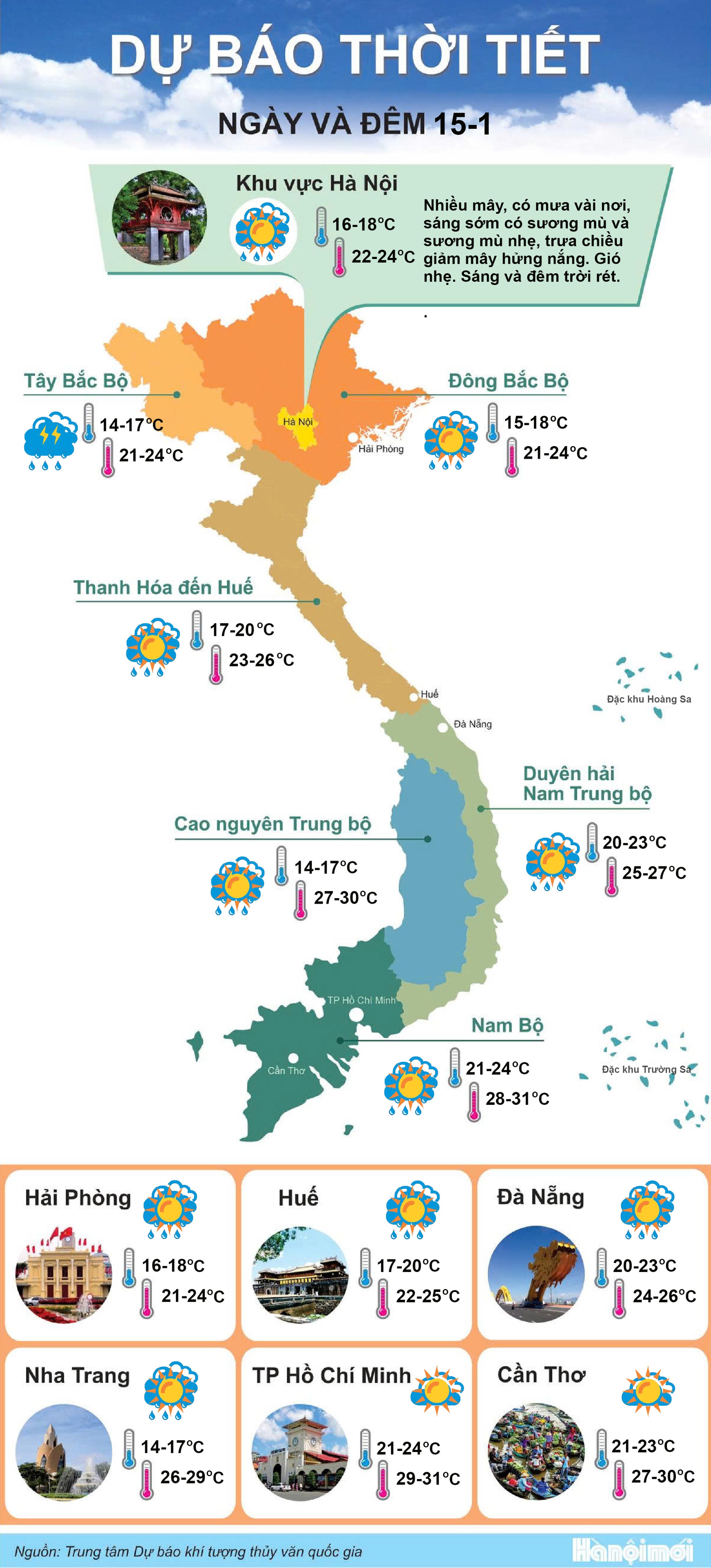 Thời tiết hôm nay 15/1: Miền Bắc trời rét, miền Nam nắng ráo