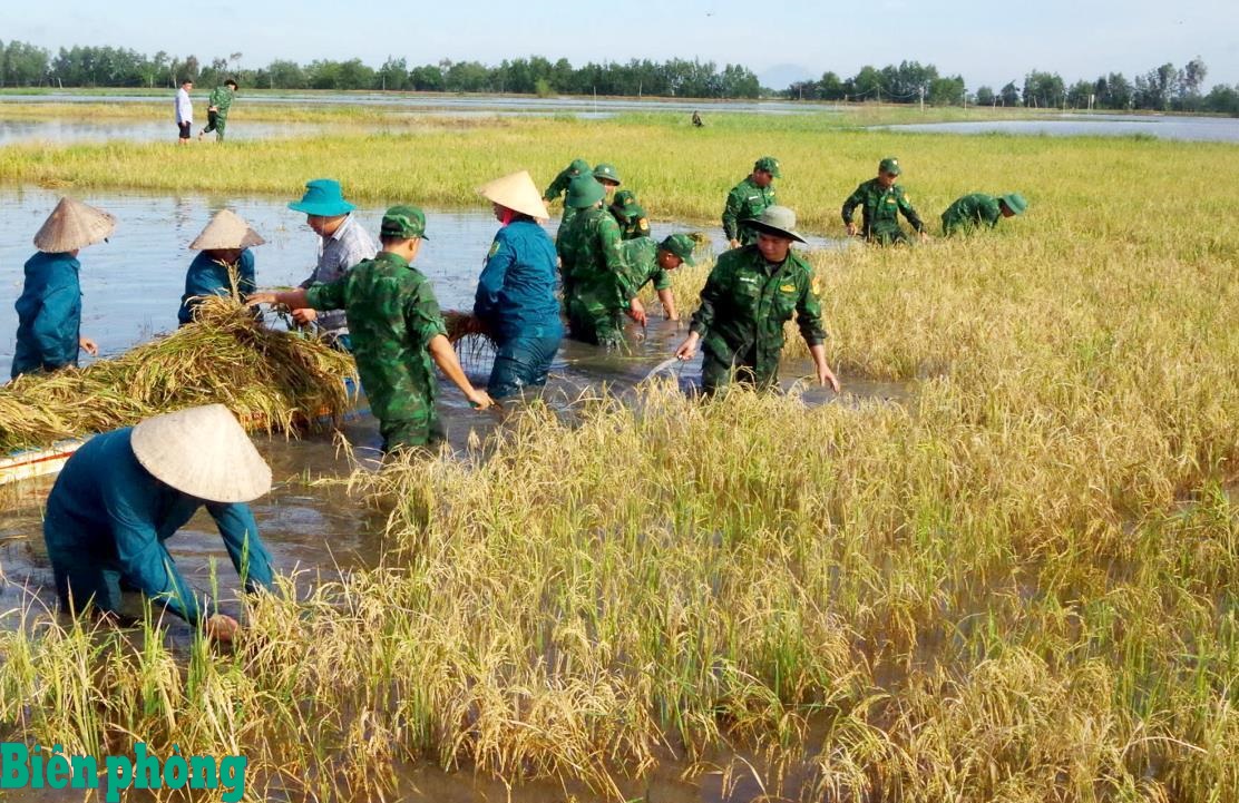 Cán bộ, chiến sĩ Đồn Biên phòng Phước Chỉ, Bộ đội Biên phòng tỉnh Tây Ninh và dân quân xã giúp dân thu hoạch lúa. Ảnh: Minh Luận