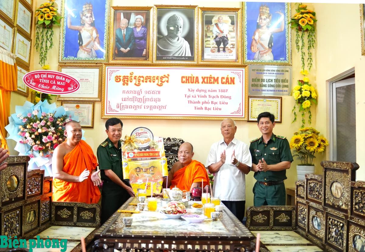 Ban Chỉ huy Bộ đội Biên phòng tỉnh Cà Mau tặng quà chúc mừng Tết Chol Chnam Thmay năm 2026 tại chùa Xiêm Cán (phường Hiệp Thành, tỉnh Cà Mau). Ảnh: Hoàng Tá