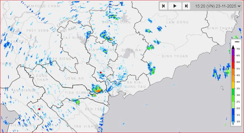 Ảnh radar thời tiết lúc 15 giờ 20 phút ngày 23-11 cho thấy trong 3-4 giờ tới, khu vực phía Đông TPHCM khả năng 95% không có mưa. Ảnh: KTTV