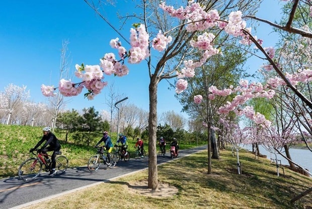 Người dân đạp xe dọc bờ sông ở Bắc Kinh (Trung Quốc). Ảnh: Xinhua/Ju Huanzong)