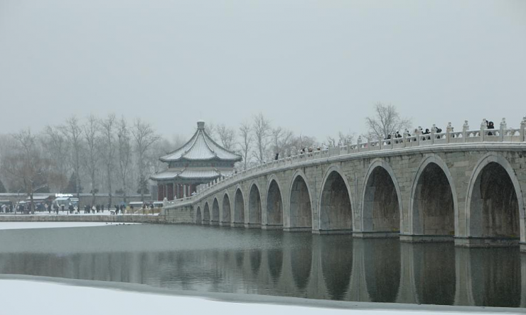 Cách trung tâm thành phố khoảng 15 km, Cung điện Mùa hè (Di Hòa Viên) cũng mang một vẻ đẹp khác lạ dưới tuyết. Hồ Côn Minh rộng lớn bắt đầu đóng băng, tạo nên một mặt gương mờ ảo. Từ xa, Phật Hương Các, biểu tượng của cung điện, hiện lên trên sườn đồi phủ tuyết.