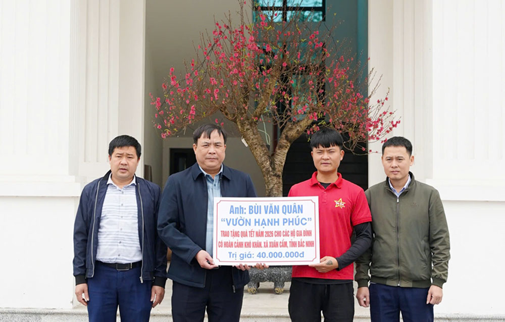 Anh Bùi Văn Quân trao kinh phí cho xã Hợp Thịnh để tặng quà Tết cho hộ nghèo, hoàn cảnh khó khăn.