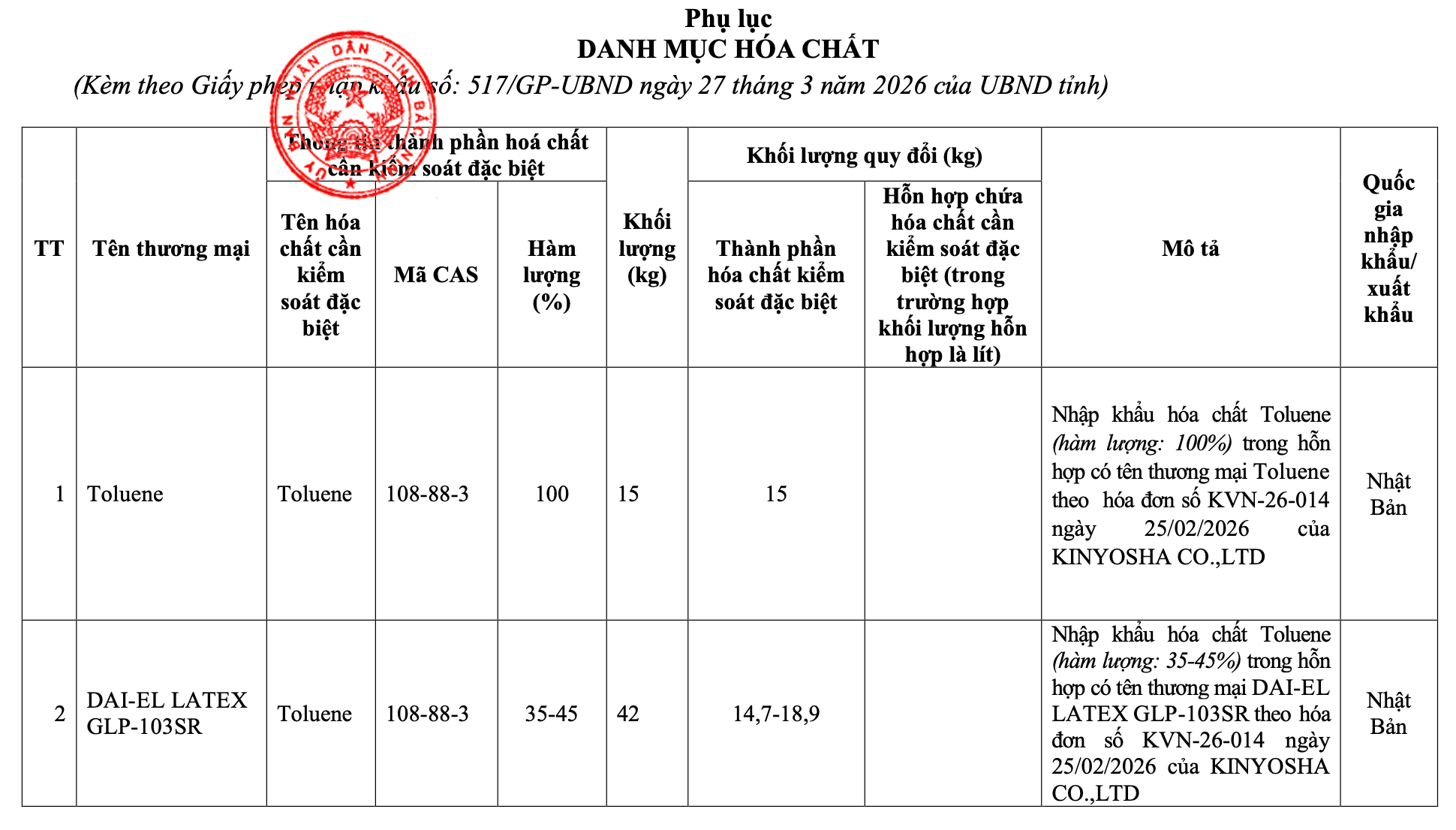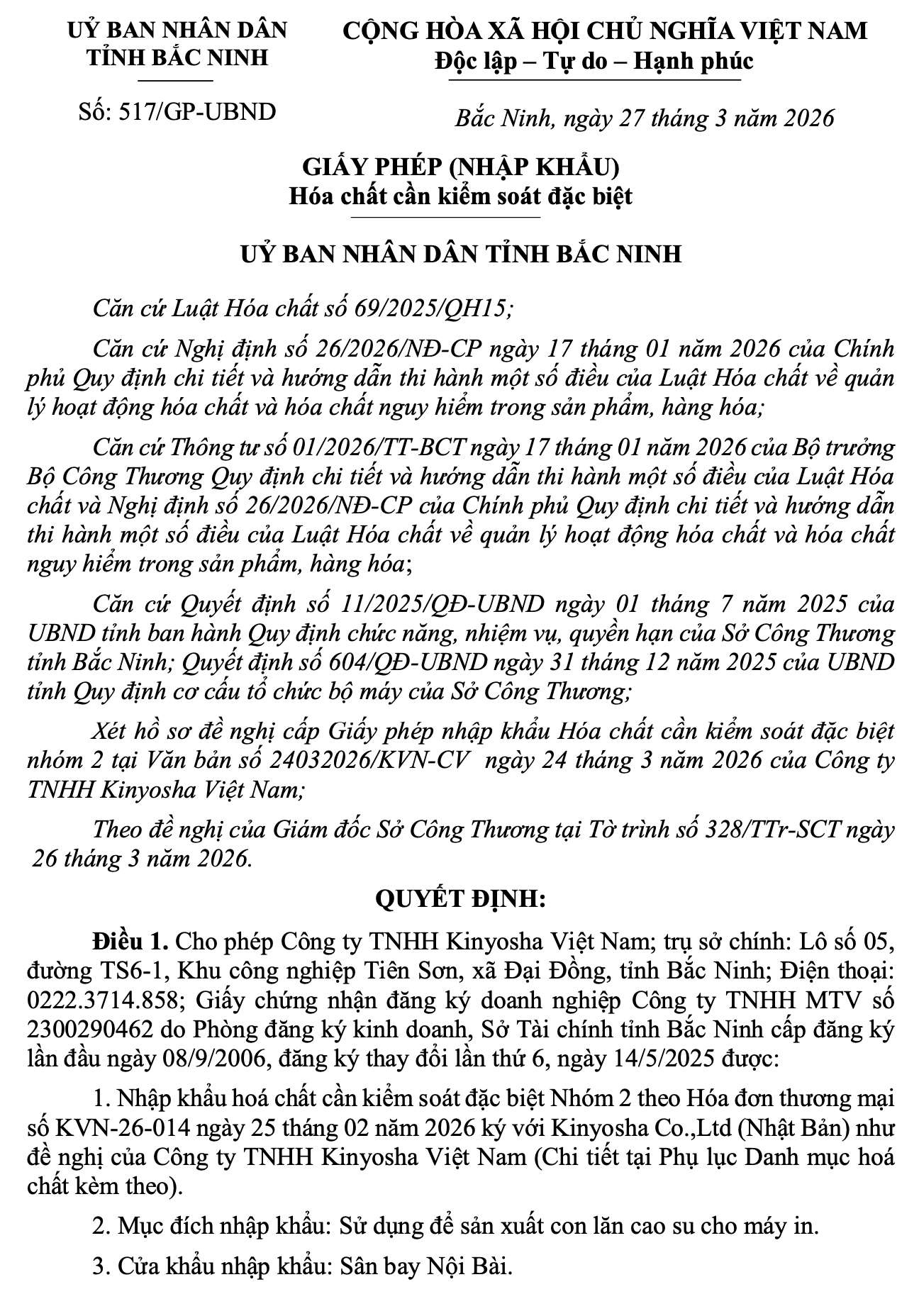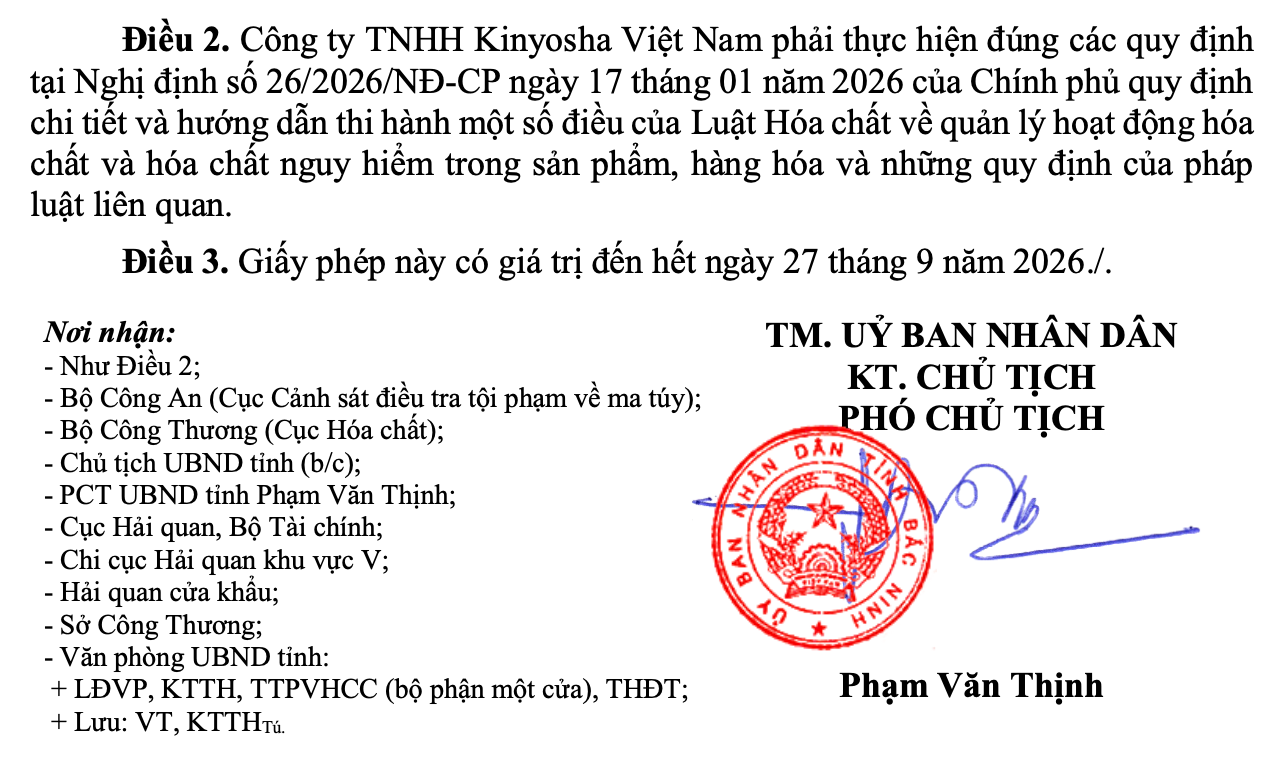 Theo Giấy phép số 517/GP-UBND, Công ty TNHH Kinyosha Việt Nam (trụ sở tại Khu công nghiệp Tiên Sơn, xã Đại Đồng, tỉnh Bắc Ninh) được phép nhập khẩu hóa chất cần kiểm soát đặc biệt nhóm 2 theo hợp đồng ký với Kinyosha Co.,Ltd (Nhật Bản).