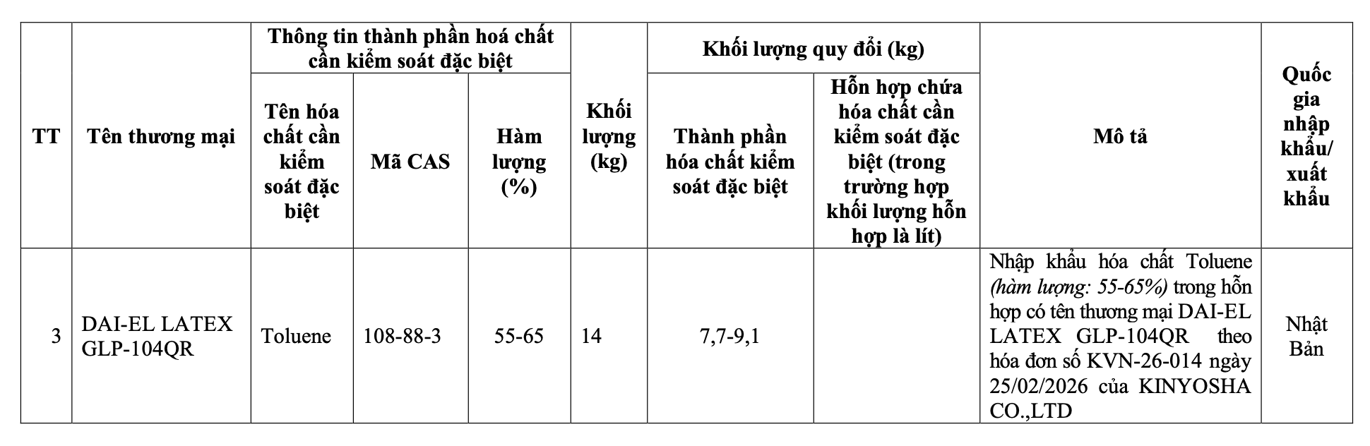 Theo phụ lục kèm theo giấy phép, các hóa chất được nhập khẩu đều có chứa Toluene (mã CAS 108-88-3), thuộc danh mục hóa chất cần kiểm soát đặc biệt. Cụ thể gồm: Toluene tinh khiết (hàm lượng 100%) với khối lượng 15kg; Hỗn hợp DAI-EL LATEX GLP-103SR (hàm lượng Toluene 35–45%) với khối lượng 42kg; Hỗn hợp DAI-EL LATEX GLP-104QR (hàm lượng Toluene 55–65%) với khối lượng 14kg.