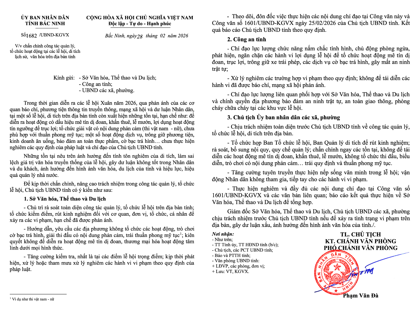 Văn bản số 1682/UBND-KGVX do Phó Chánh Văn phòng UBND tỉnh Bắc Ninh Phạm Văn Đà ký ngày 28/02/2026.