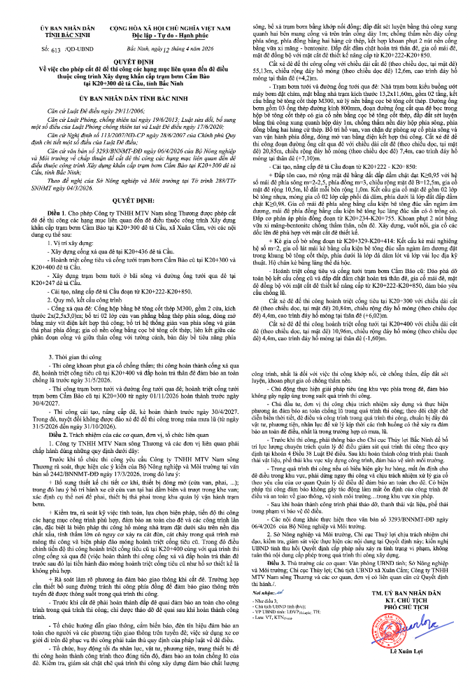Quyết định số 613/QĐ-UBND do Phó Chủ tịch UBND tỉnh Bắc Ninh Lê Xuân Lợi ký ngày 12/04/2026.