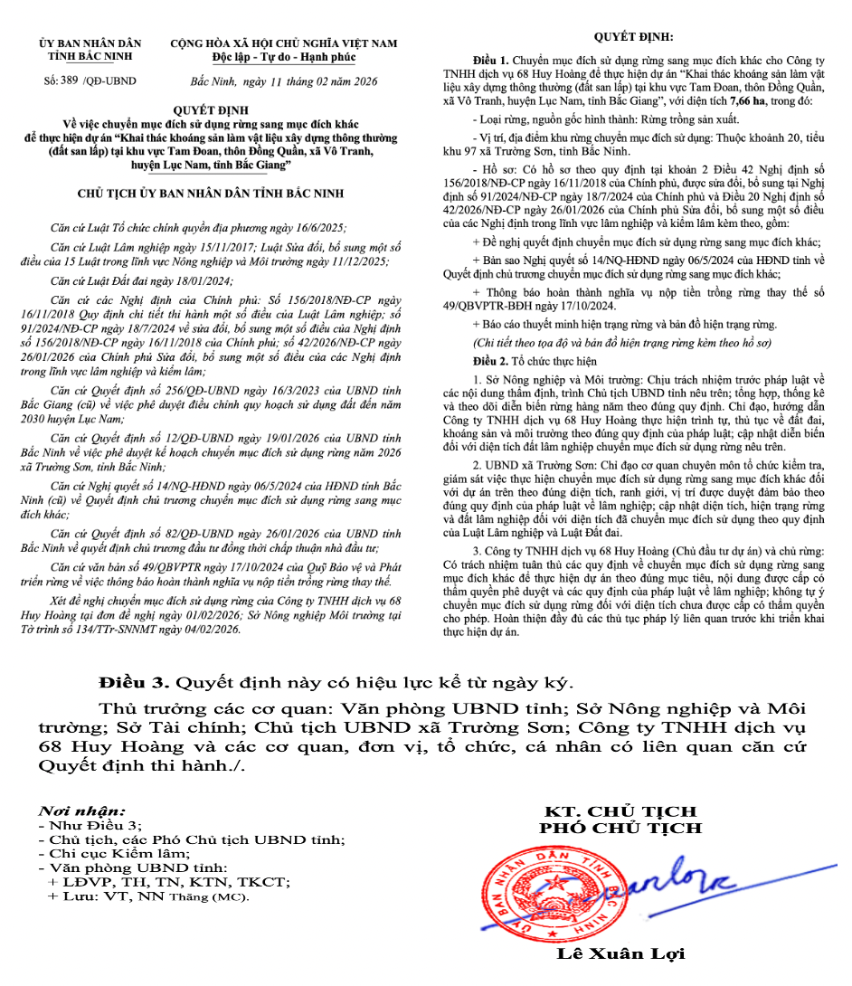 Quyết định số 389/QĐ-UBND do Phó Chủ tịch UBND tỉnh Bắc Ninh Lê Xuân Lợi ký ngày 11/02/2026.