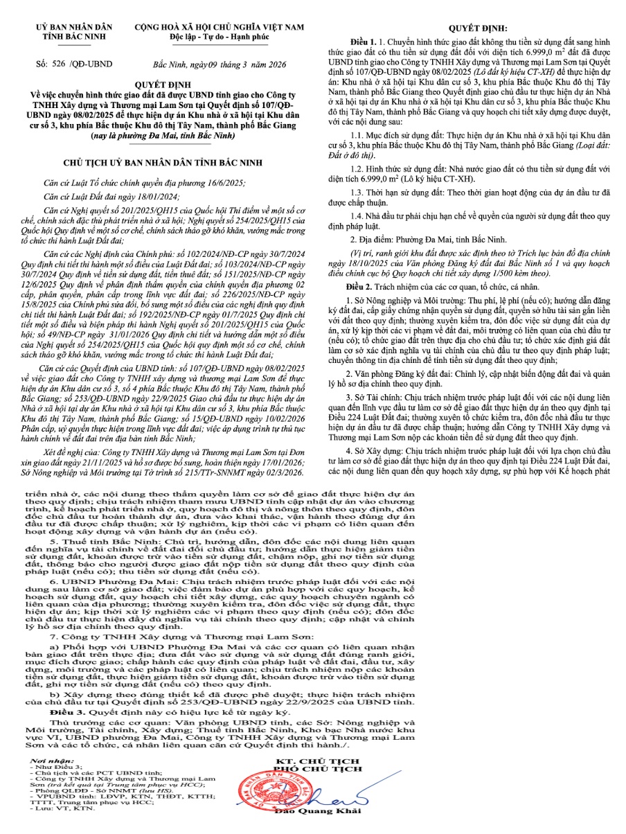 Theo Quyết định của UBND tỉnh Bắc Ninh, diện tích 6.999,0m2 đất (lô đất ký hiệu CT-XH) trước đây được giao không thu tiền sử dụng đất cho Công ty TNHH Xây dựng và Thương mại Lam Sơn tại Quyết định số 107/QĐ-UBND ngày 08/02/2025 nay được chuyển sang hình thức giao đất có thu tiền sử dụng đất để thực hiện dự án Khu nhà ở xã hội.
