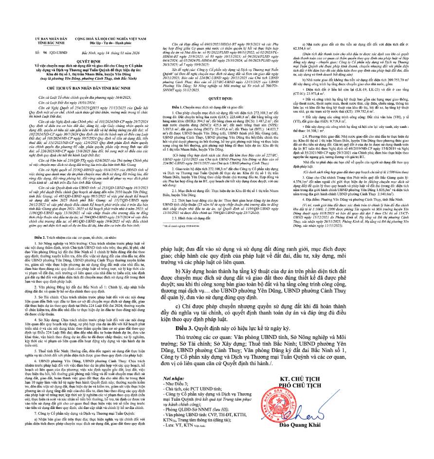 UBND tỉnh Bắc Ninh giao toàn bộ 272.108,3m2 đất cho Công ty Cổ phần xây dựng và Dịch vụ Thương mại Tuấn Quỳnh để thực hiện dự án Khu đô thị số 1 Nham Biền theo chấp thuận chủ trương đầu tư, hợp đồng và các phụ lục hợp đồng dự án BT, quy hoạch chi tiết xây dựng được phê duyệt.