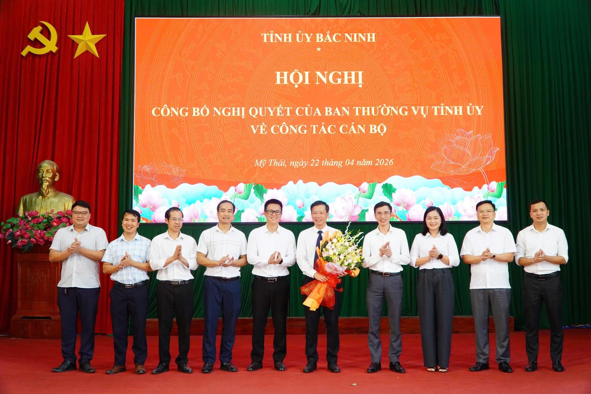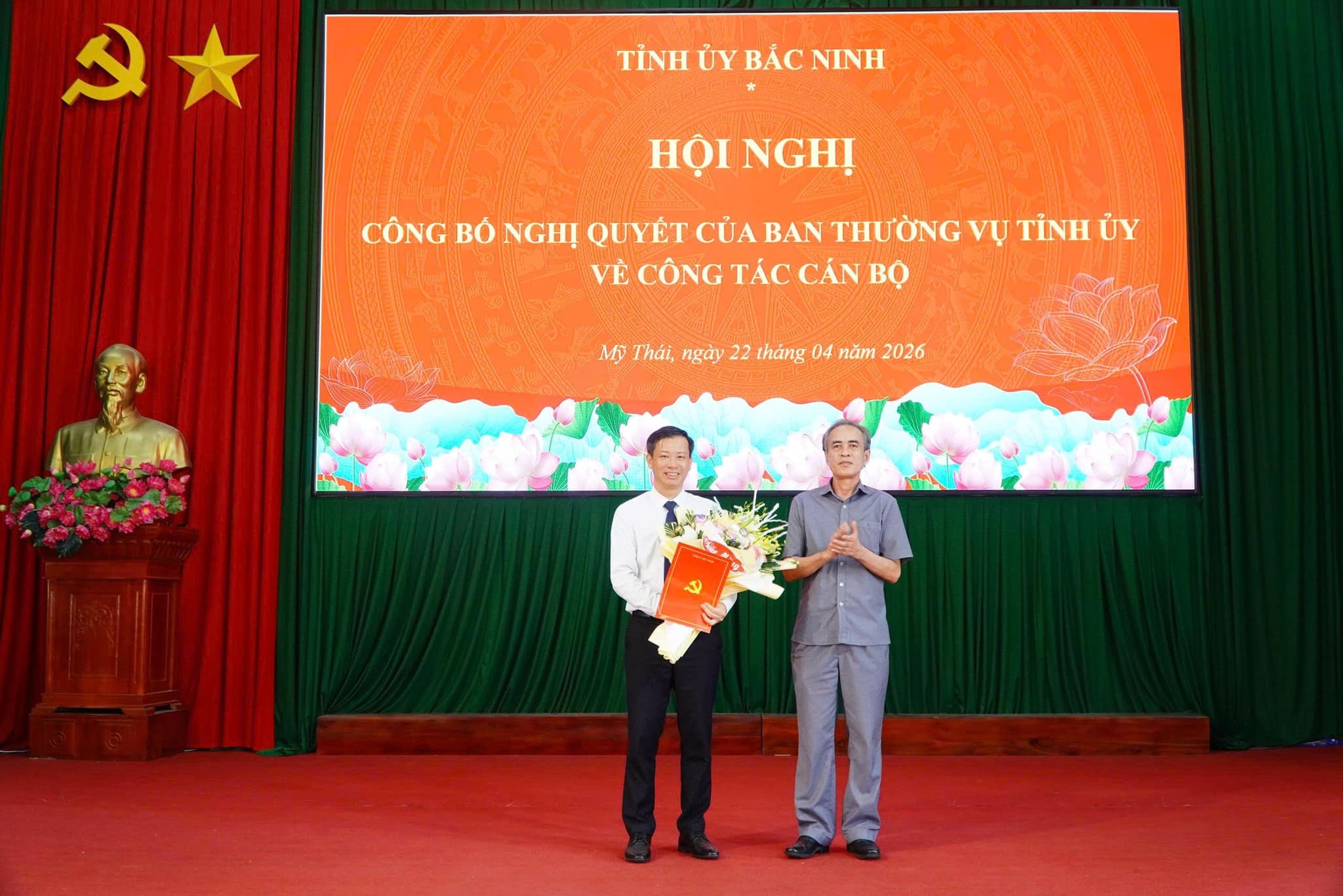 Lãnh đạo Ban Tổ chức Tỉnh ủy Bắc Ninh trao quyết định, tặng hoa chúc mừng đồng chí Phạm Văn Hải nhận nhiệm vụ tại xã Mỹ Thái.