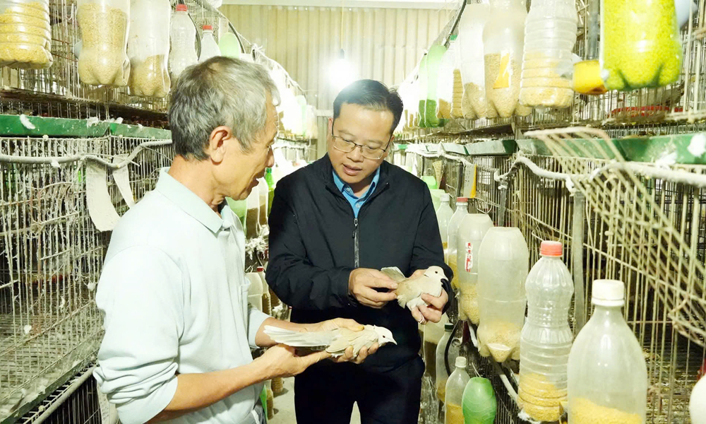 Đồng chí Nguyễn Văn Long, Chủ tịch UBND xã Tiên Lục (bên phải) tìm hiểu mô hình nuôi chim cu gáy trắng tại thôn Sâu. Ảnh: Thanh Nga.