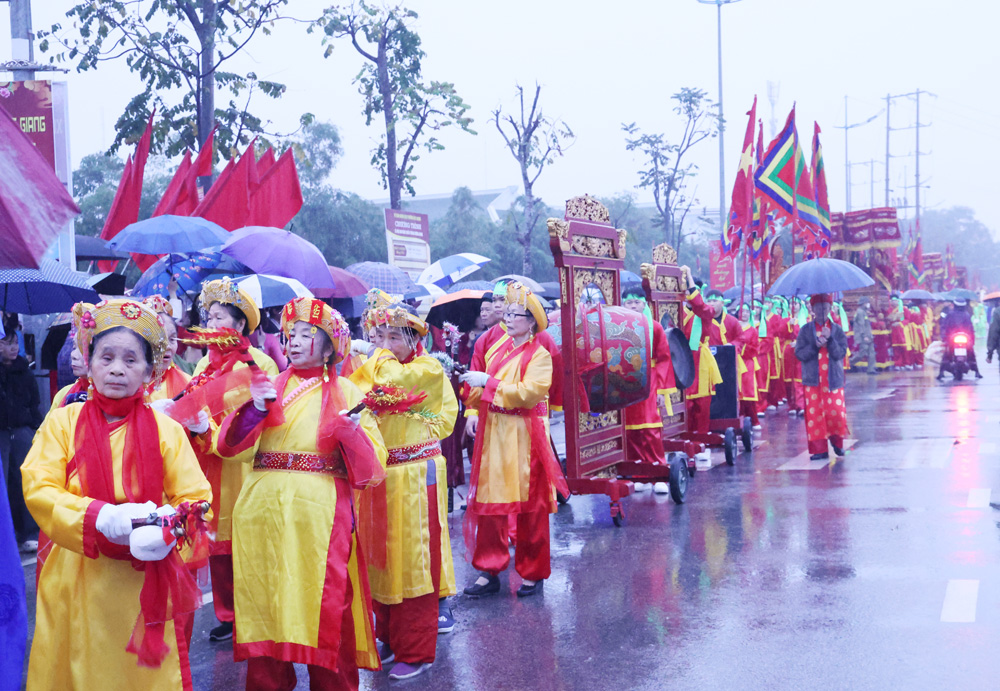 Các lực lượng tham gia lễ rước kiệu tạo nên sắc màu văn hóa truyền thống tại Lễ hội Chiến thắng Xương Giang.
