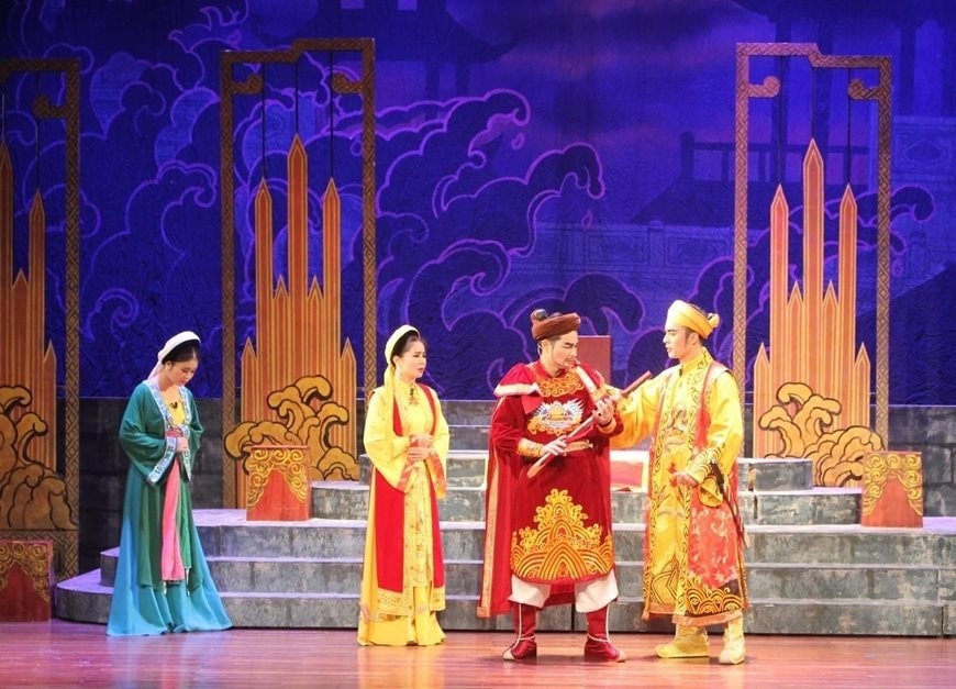 Cảnh trong vở “Mật chỉ giữa hoàng cung” của Nhà hát Chèo Quân đội đoạt Huy chương Vàng tại Liên hoan chèo toàn quốc năm 2022.