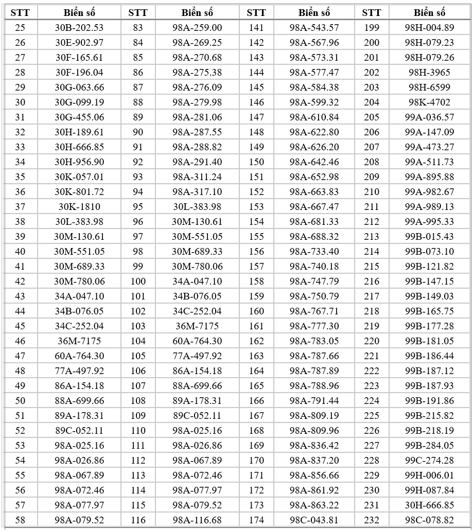 Thông tin tra cứu trên website chính thức của Cục Cảnh sát Giao thông: https://www.csgt.vn/tra-cuu-phuong-tien-vi-pham.html. Các chủ phương tiện có tên trong danh sách chủ động liên hệ Phòng Cảnh sát giao thông Công an tỉnh Bắc Ninh hoặc các đội cảnh sát giao thông phụ trách địa bàn để giải quyết vi phạm theo đúng quy định. Các trường hợp cố tình chậm trễ sẽ bị xử lý nghiêm theo luật định.