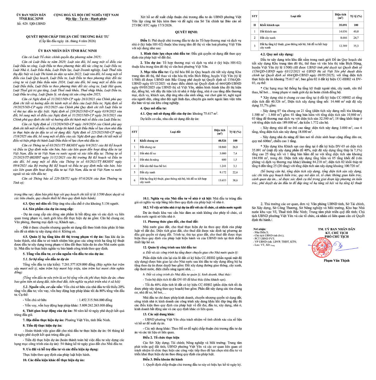 Quyết định số 626/QĐ-UBND do Phó Chủ tịch UBND tỉnh Bắc Ninh Phạm Văn Thịnh ký ngày 16/04/2026.