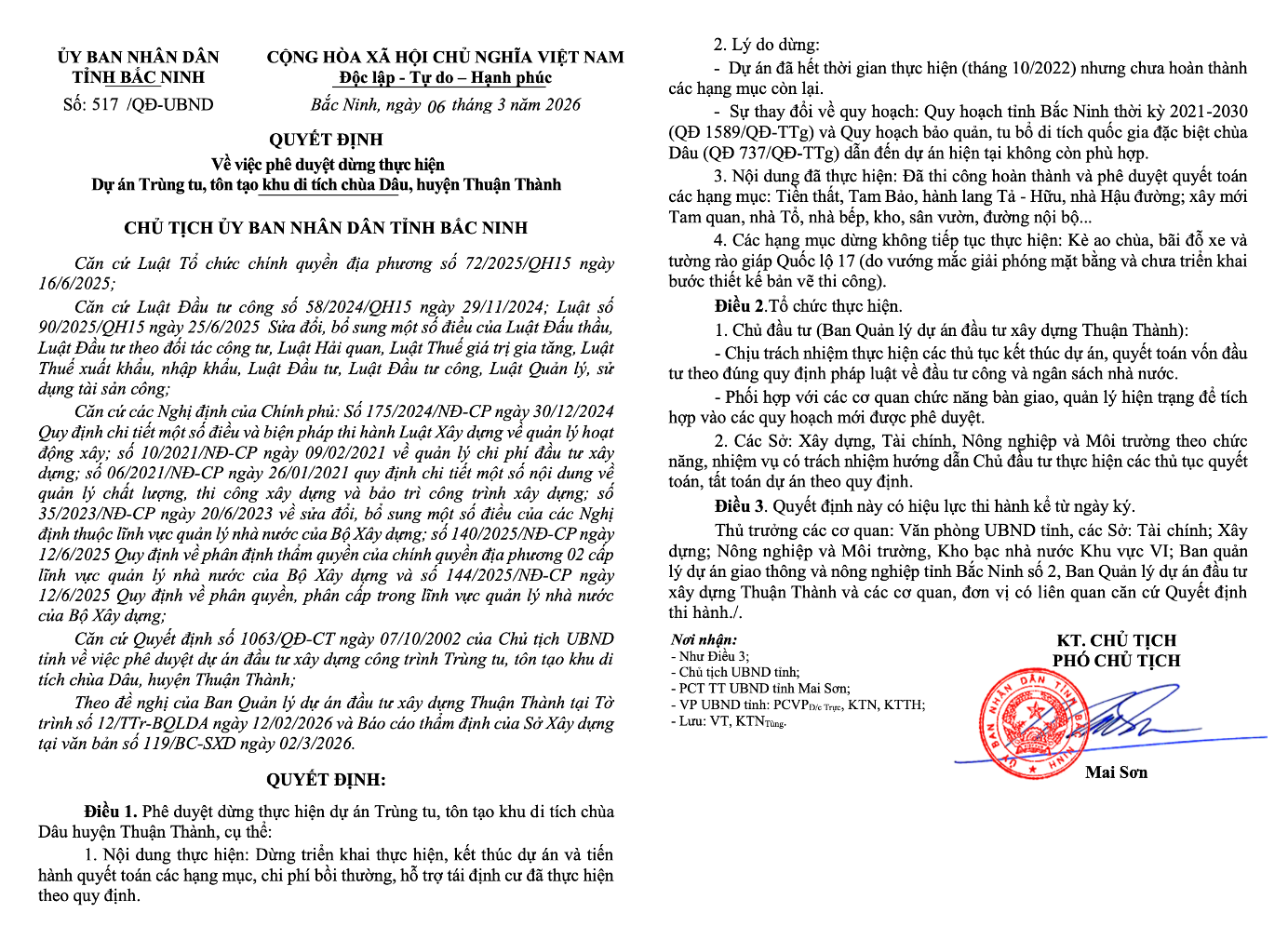 Quyết định số 517/QĐ-UBND do Phó Chủ tịch UBND tỉnh Bắc Ninh Mai Sơn ký ngày 06/03/2026.