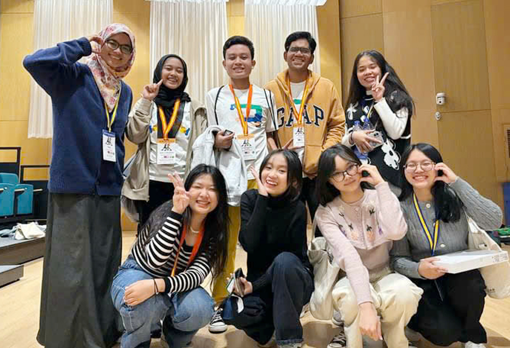 Em Lưu Hoàng Linh (hàng dưới, thứ 2 từ phải sang) giao lưu cùng bạn bè quốc tế tại chương trình giao lưu quốc tế International Korean Education Youth Camp 2023.