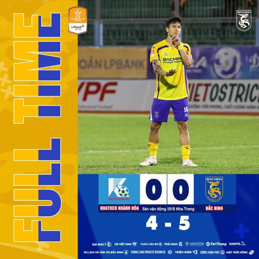 Chung cuộc, đội bóng đất Kinh Bắc đã giành chiến thắng với tỷ số 5-4 trong loạt đấu súng, qua đó chính thức ghi tên mình vào vòng tứ kết Cúp Quốc gia. Đây là một thành tích đáng khích lệ cho tân binh của giải hạng Nhất năm nay.