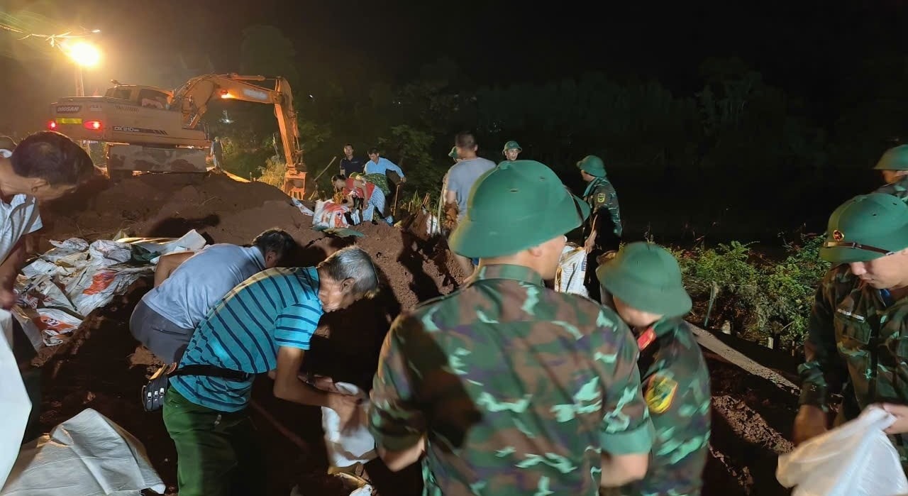 Lãnh đạo xã cùng cán bộ, chiến sĩ Bộ Chỉ huy Quân sự tỉnh Bắc Ninh trong đêm thứ 3 liên tiếp cùng nhân dân xã Mỹ Thái chống lũ. Ảnh: Nguyễn Tuấn Anh.