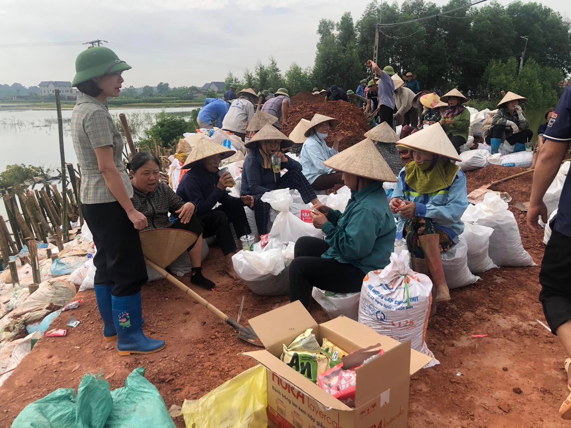 Cán bộ, nhân dân xã Mỹ Thái trong phút nghỉ ngơi sáng 11-10 khi tham gia nâng cao đê chắn lũ dâng. Ảnh: Nhóm Người Mỹ Thái.